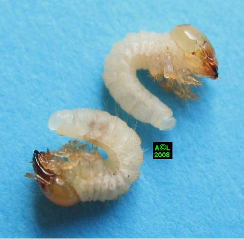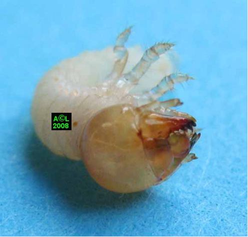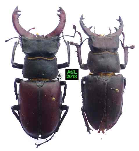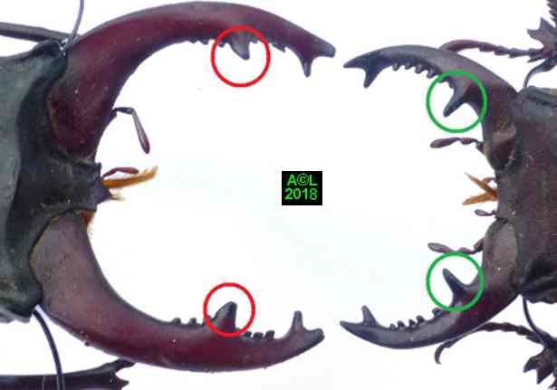 !Morphologiquement très proche, et un temps considéré comme simple sous-espèce ( voire carrément "négligé" ! ), le lucane méridional (Lucanus tetraodon) n'excède pas 50 mm, et de prime abord la confusion est aisée avec des "cervus" de petite taille. Outre la relative modestie de sa stature, le lucane méridional est plus sombre, plus terne, et le peigne antennaire a 6 dents ... et donc une de plus que son "grand frère" ! A cela s'ajoute un denticule mandibulaire très différemment situé qui représente, à mon avis, le plus fiable critère sélectif (illustré ci-dessous). La biologie de L. tetraodon est identique à celle de L. cervus.