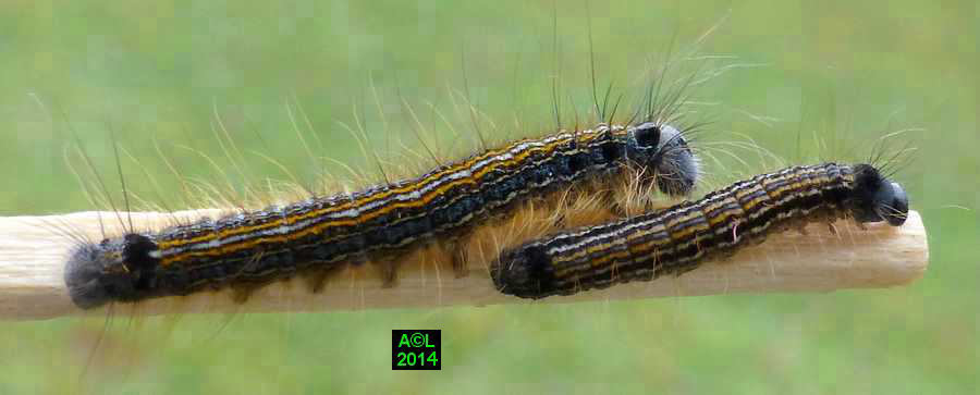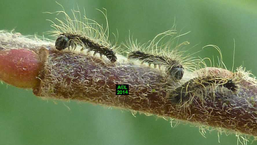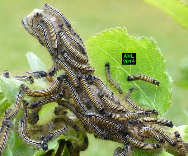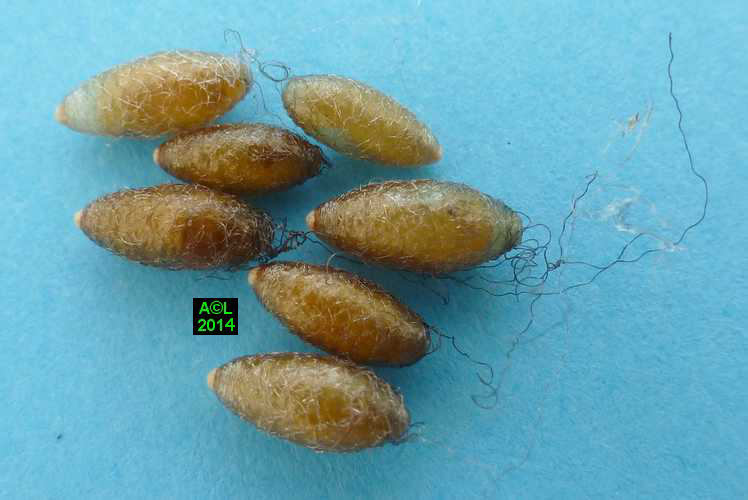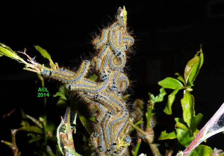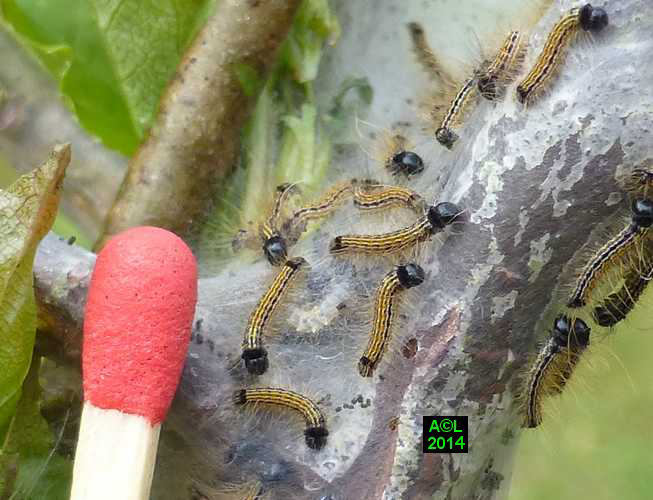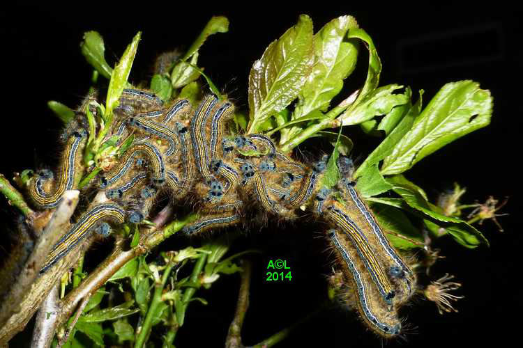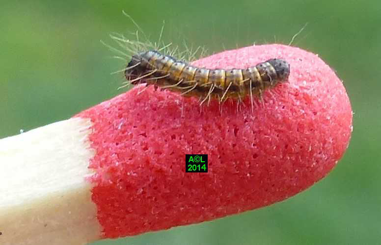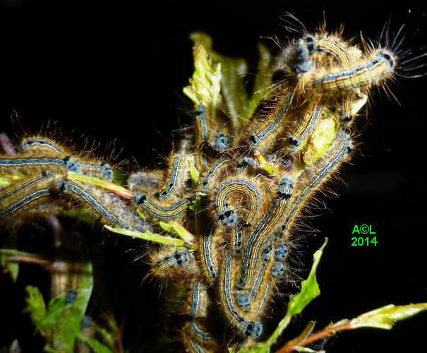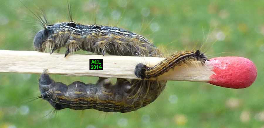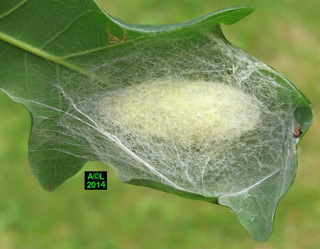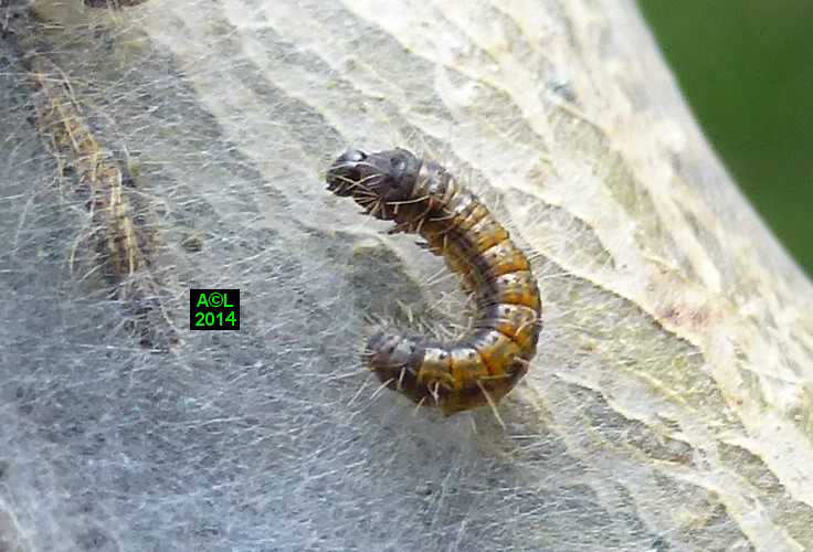 (*) J'avoue tout ignorer de cette excrétion (origine, composition, raison d'être), sauf à supposer qu'il pourrait s'agir d'urates, autrement dit de déchets organiques rejetés lors du tissage. Le même "phénomène", en nettement plus abondant, s'observe chez la "Feuille morte du chêne" (Gastropacha quercifolia) cf. site. Si un lecteur peut éclairer ma lanterne, je suis bien sûr preneur des 2 mains !