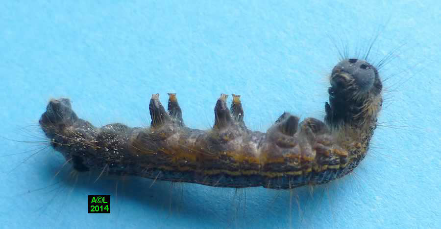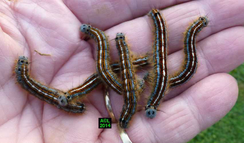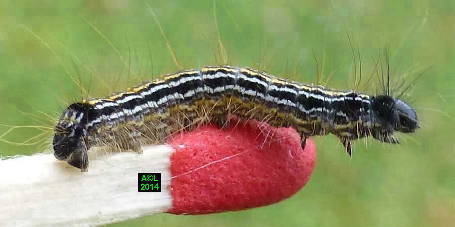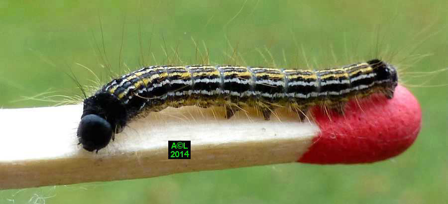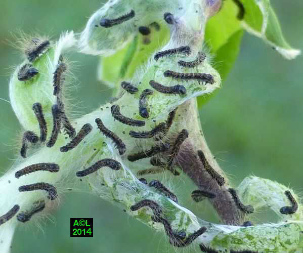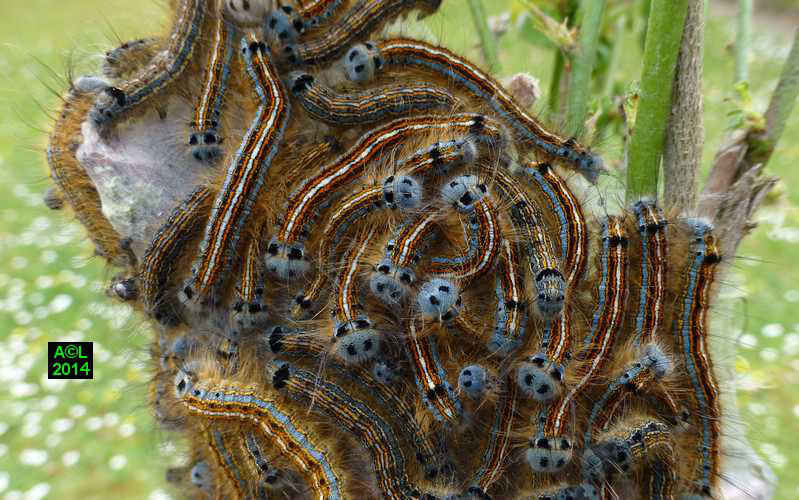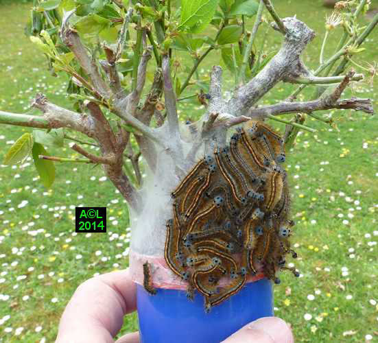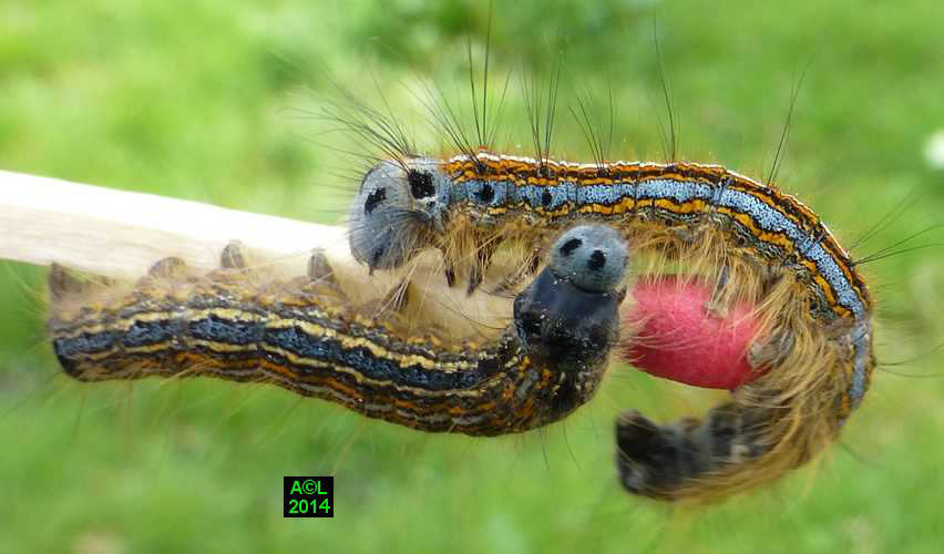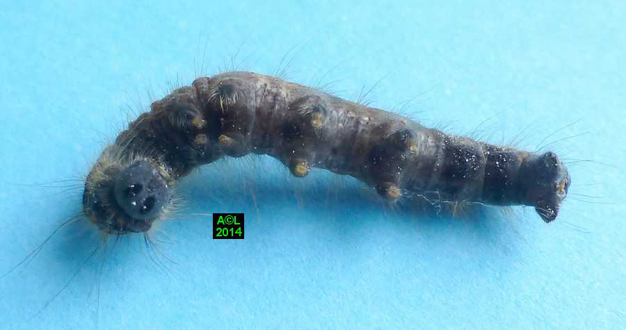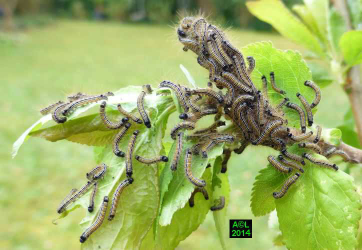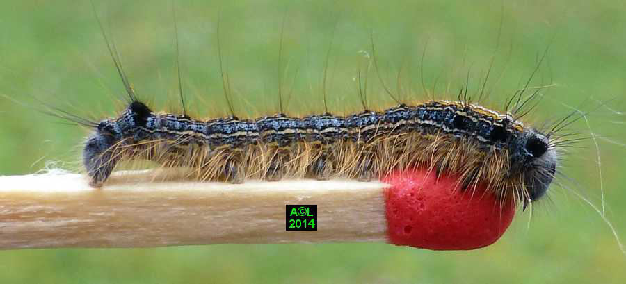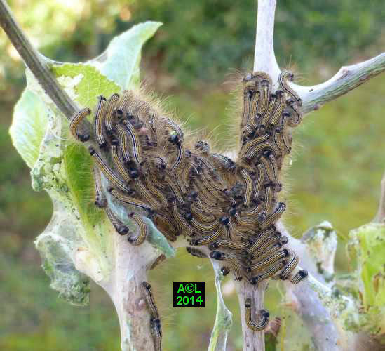 (*) J'avoue tout ignorer de cette excrétion (origine, composition, raison d'être), sauf à supposer qu'il pourrait s'agir d'urates, autrement dit de déchets organiques rejetés lors du tissage. Le même "phénomène", en nettement plus abondant, s'observe chez la "Feuille morte du chêne" (Gastropacha quercifolia) cf. site. Si un lecteur peut éclairer ma lanterne, je suis bien sûr preneur des 2 mains !
