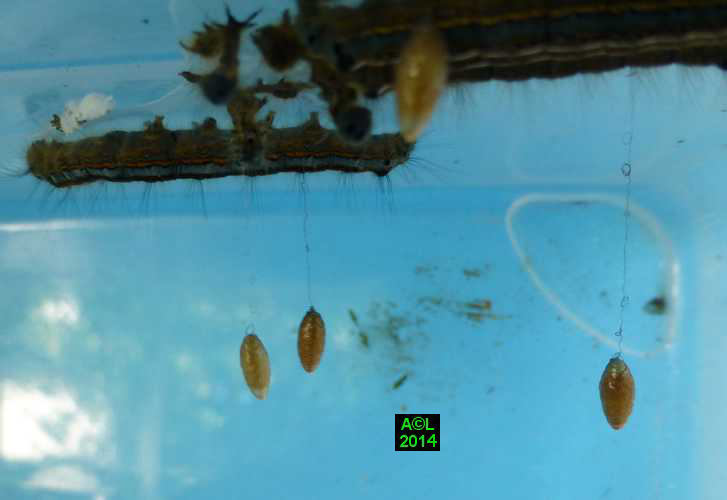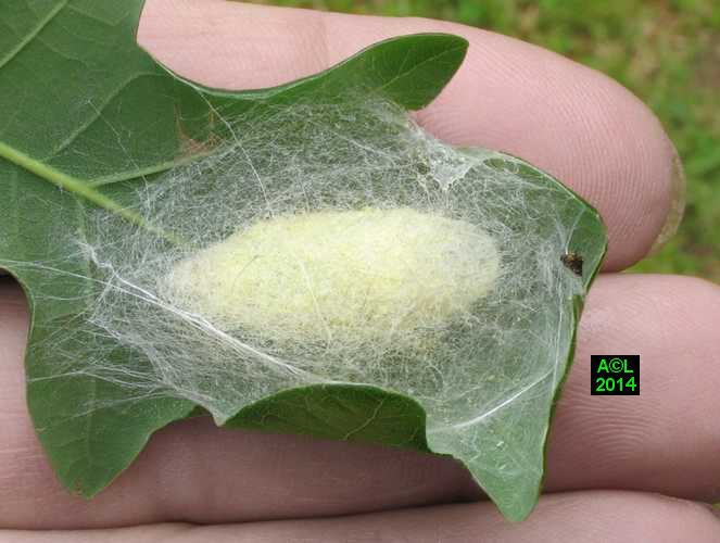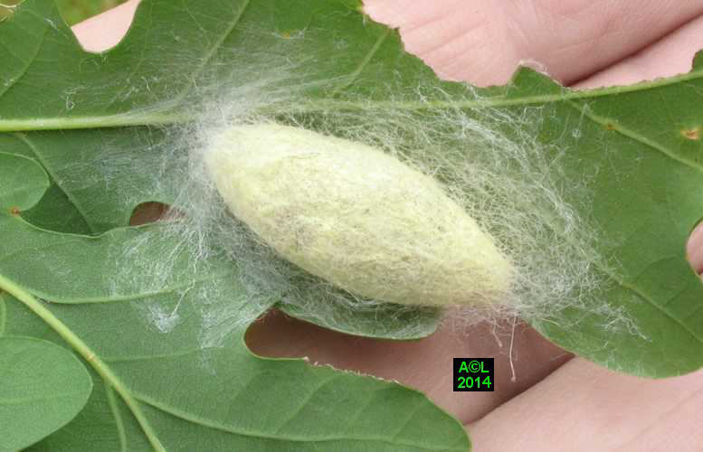Au terme de leur développement, et donc en juin-juillet selon régions, les chenilles se dispersent pour coconner, ce qu'elles font le plus souvent dans le feuillage même de l'arbre nourricier, mais parfois à terre dans la couverture herbacée, la litière superficielle, ou encore les feuilles mortes. Très oblongs, et joliment soufrés, les cocons sont plus ou moins parsemés d'une sécrétion poudreuse (*) de même couleur que l'on retrouve également à l'intérieur et sur les chrysalides. L'émergence des papillons intervient 4 à 6 semaines semaines plus tard.