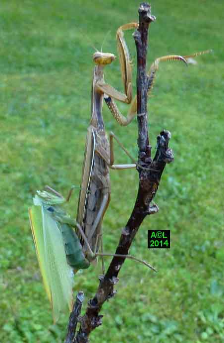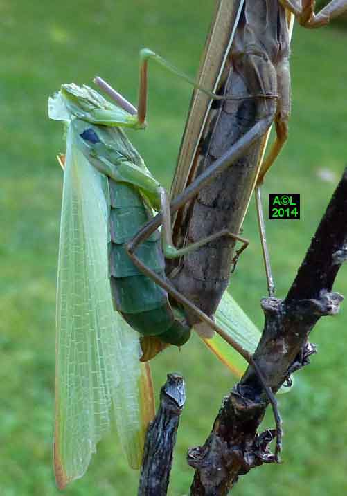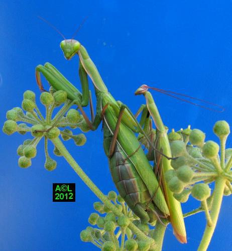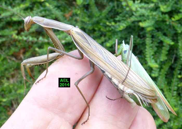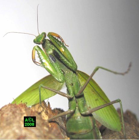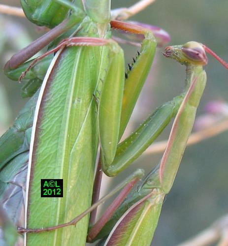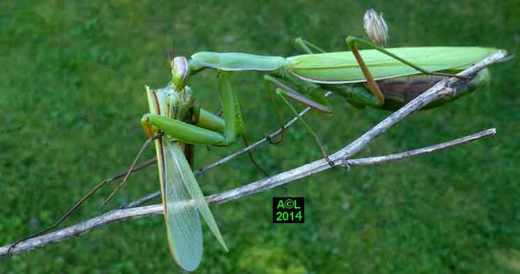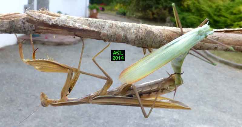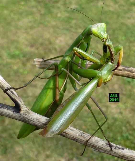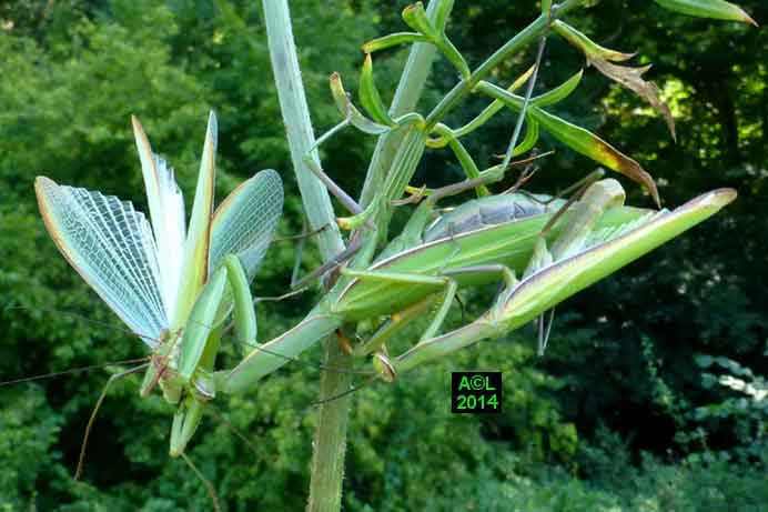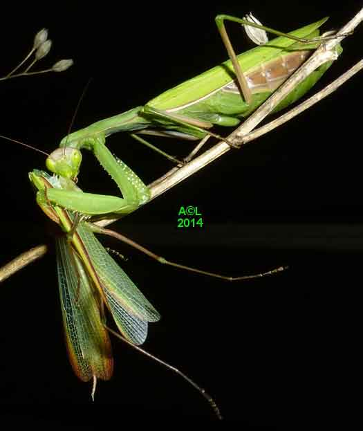Au pays des mantes religieuses les amours peuvent également s'avérer fatales pour le mâle, mais c'est loin d'être systématique, l'envol salvateur prévalant le plus souvent. Cela dit notre mâle n'a pas intérêt à "s'endormir sur ses lauriers", et encore moins à demeurer à portée des pattes ravisseuses de sa partenaire. Le "passage à table" ( si je puis dire ! ), est d'autant plus spectaculaire qu'il peut intervenir alors que les bestioles sont encore accouplées, mais cela est à mon avis peu fréquent et reste sans doute subordonné à un ventre particulièrement affamé.