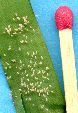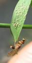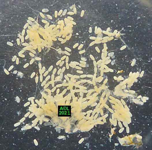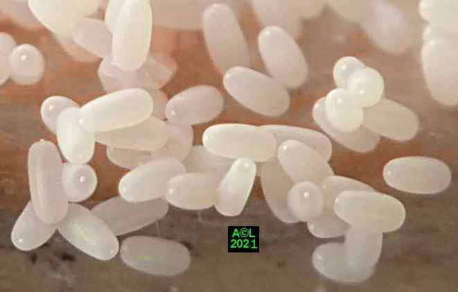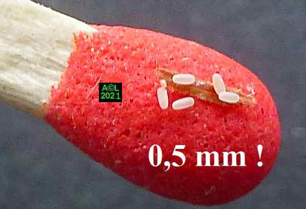 Comme cette vidéo le montre, quelques rapides tapotements à la surface du substrat permettent de coller le pédicelle. Ce dernier s'étire ensuite à la manière d'un élastique, en donnant la nette impression d'extraire l'oeuf de l'abdomen, puis il se rétracte à la longueur voulue une fois l'oeuf émis. Vous noterez que la longueur du pédicelle en question est un peu inférieure à celle des oeufs, mais aussi qu'il est particulièrement ténu (1/100e de mm), au point d'être tout juste visible à la loupe binoculaire. Cette finesse fait qu'il se courbe aisément tous azimuts, sous le simple poids de l'oeuf. En toute logique le pédicelle est implanté à l'extrémité de l'oeuf, du côté opposé au "micropyle" (= orifice permettant le passage des spermatozoïdes ! )