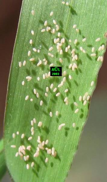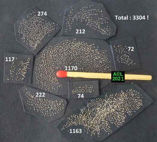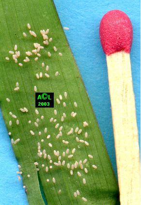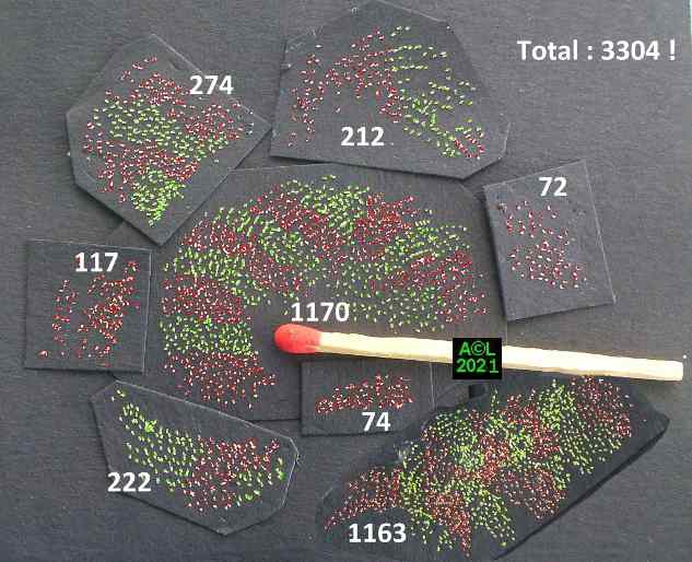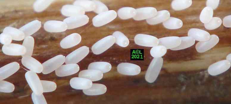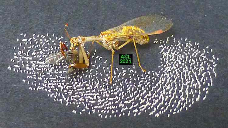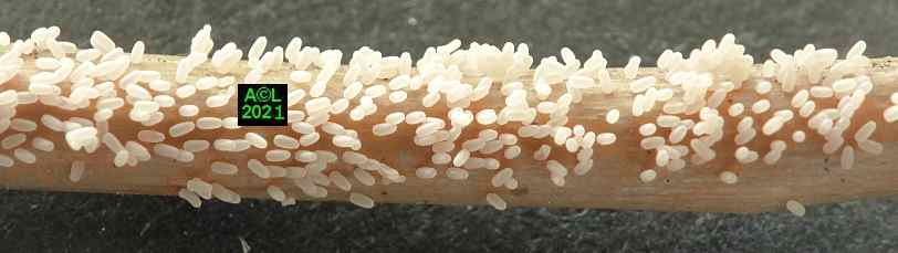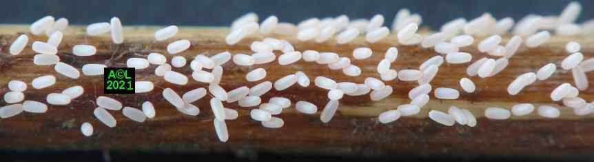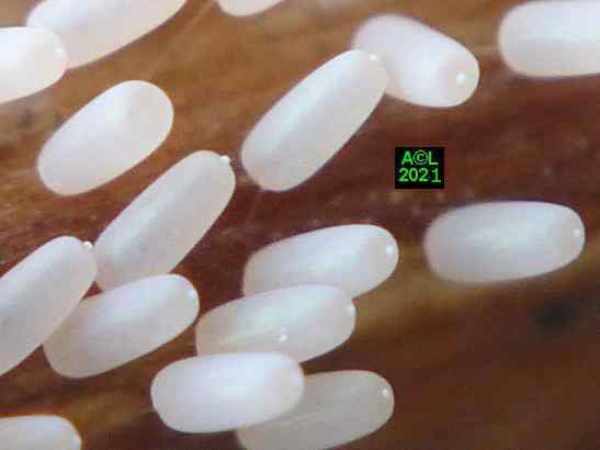 Brièvement pédicellés, les oeufs en question semblent déposés au gré des pérégrinations de l'insecte, avec toutefois une préférence pour les arbres, les anfractuosités de l'écorce offrant une certaine protection. Sur une surface plane les oeufs sont généralement déposés à distance les uns des autres, et en arcs de cercles plus ou moins concentriques. A contrario, sur une surface plus réduite (tige herbacée par exemple) la "distanciation" n'est pas toujours de mise, d'où des juxtapositions, superpositions, et accumulations, comme vous le verrez ci-après.