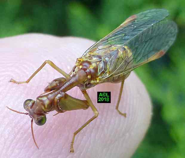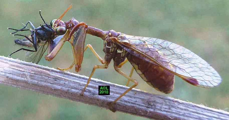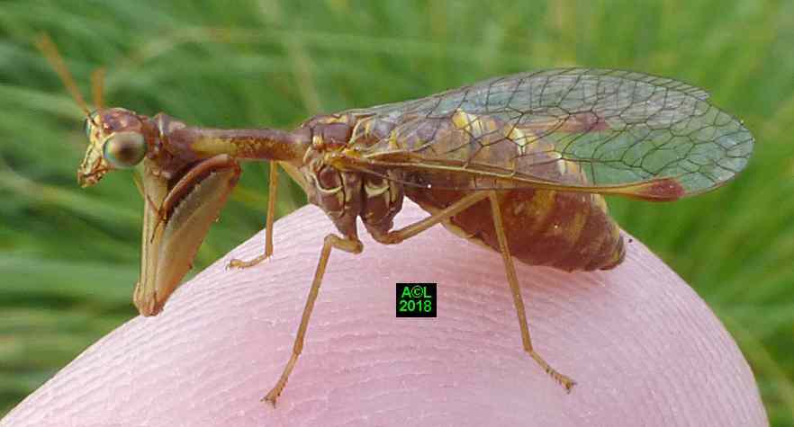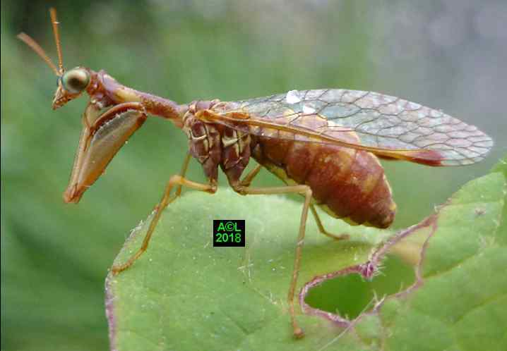 Mantispe païenne !En fait Mantispa styriaca (= pagana) relève des Névroptères = Neuroptères, insectes principalement caractérisés par le port de 4 ailes membraneuses, très densément "résillées", et restant planes au repos, d'où le terme de "Planipennes" plus anciennement employé.