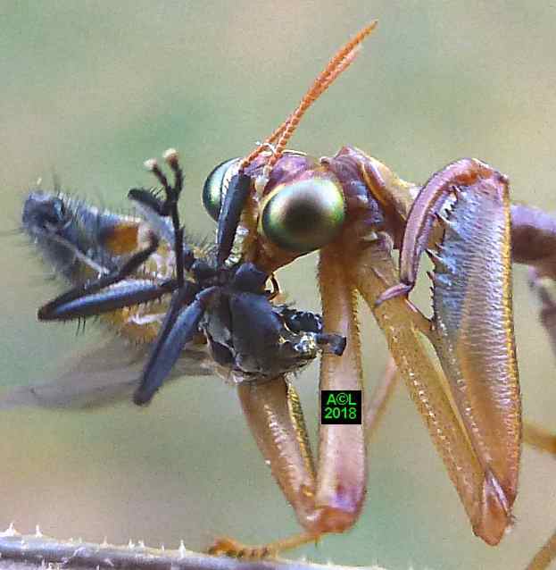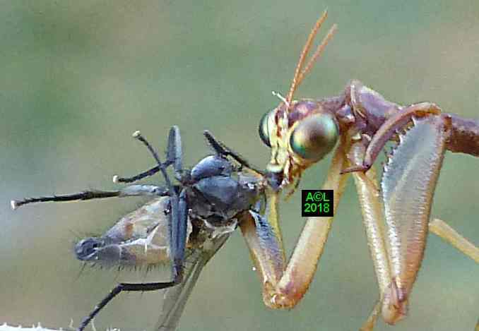 ... ou Mantispe païenne !La Mantispe vole aisément, mais brièvement. Elle passe pour être active de jour comme de nuit, le surdimensionnement des yeux faisant foi, tout comme la propension à "venir" aux UV. Perso j'avoue m'interroger car la curieuse bestiole chasse plus volontiers à l'affût qu'à courre, et ses proies de prédilection (mouches) sont inactives de nuit. J'ajouterais qu'un trio en élevage (2 mâles, 1 femelle) poursuivait ses activités lors de la survenue du crépuscule, les bestioles s'immobilisant totalement une fois la nuit tombée ... ou la lumière éteinte ! Les mantispes passent le plus clair de leur temps sur les arbres et arbustes, buissons et grandes herbes étant semble-t-il moins prisés.