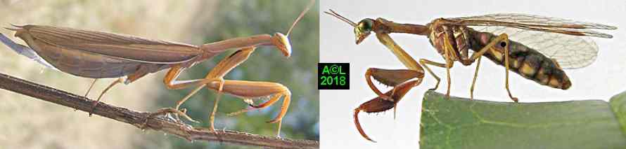 La mantispe (ci-dessous à droite) est de petite taille, au plus 20 mm de corps, pour le double d'envergure. De prime abord cet insecte ressemble étonnamment à une minuscule mante religieuse (ci-dessous à gauche), à la fois par la similitude des attitudes et du profil, mais surtout par la présence de pattes antérieures dites "ravisseuses", de surcroît particulièrement développées et adaptées à la capture des proies.