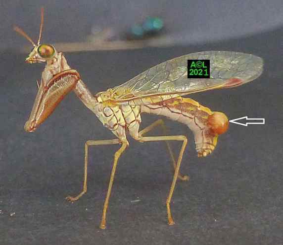 !La parade est avant tout l'apanage du mâle, et la manifestation la plus évidente et spectaculaire du dimorphisme comportemental. S'y ajoute un aspect physiologique plus ou moins concomitant se traduisant par l'émission de phéromones sexuelles visant évidemment à "conditionner" la femelle. Ces phéromones sont émises via une volumineuse glande évaginable sensiblement hémisphérique se situant dorsalement au niveau du 5e segment abdominal ( et donc du 5e tergite ! ). La parade commence généralement par de légers soulèvements des ailes, plus ou moins rythmés, accompagnés de battements abdominaux verticaux, relativement peu rapides et amples. Quand la surexcitation bat son plein la bestiole se dresse sur ses pattes locomotrices, l'abdomen et l'avant-corps se relevant pour former une sorte de "V". Dans le même temps les ailes passent à la verticales, les mouvements abdominaux s'accentuent en ampleur et vitesse, et les pattes ravisseuses se "brandissent" plus ou moins longuement et lentement, tantôt simultanément, tantôt à tour de rôle. La femelle semble plus passive, mais dans une moindre mesure elle peut répondre quasi à l'identique aux avances du mâle.