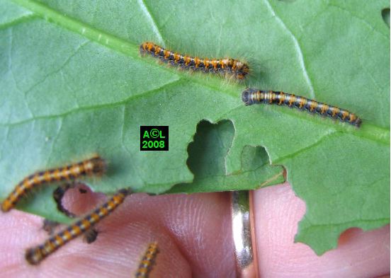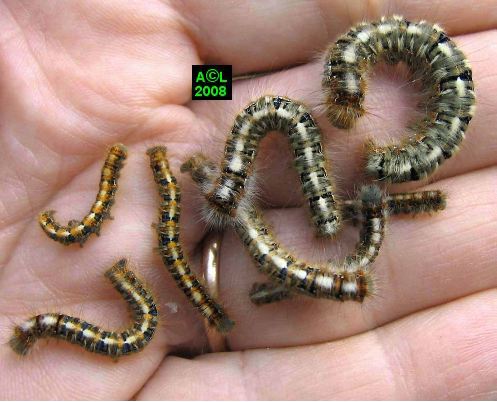 droite: 1 & 2)- chenilles au stade "hivernage"; 3)-