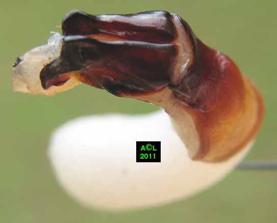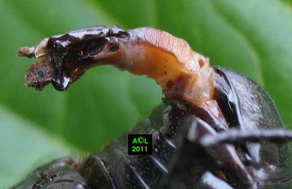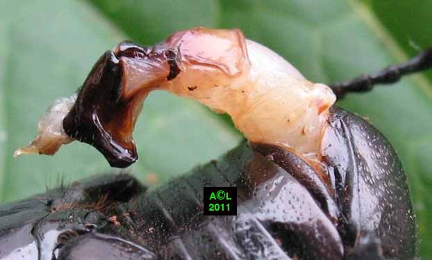 L'édéage des insectes mâles, disons le pénis pour faire simple, est dévaginable et souvent très développé. A cet égard notre Pique-prune est démonstratif , mais sans plus oserais-je dire, car dans les cas extrêmes le pénis peut atteindre la longueur du corps ... voire la dépasser !