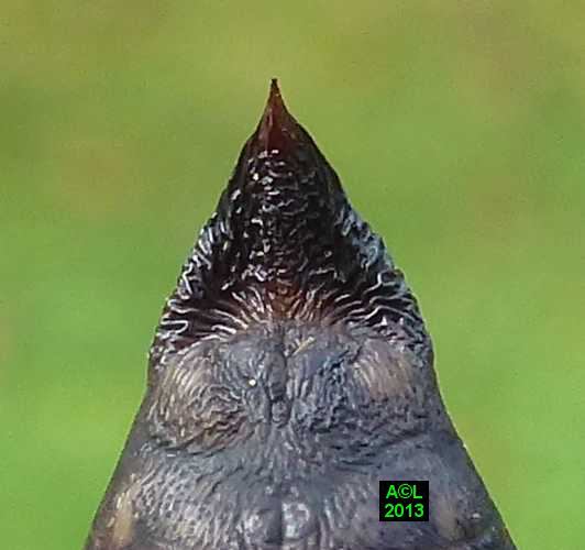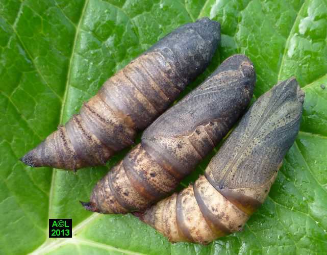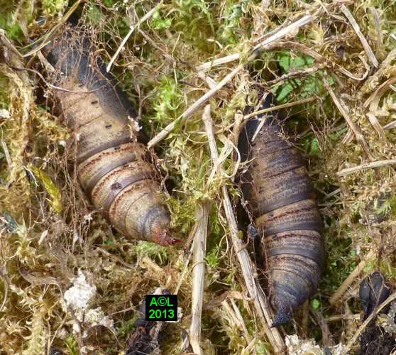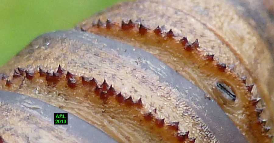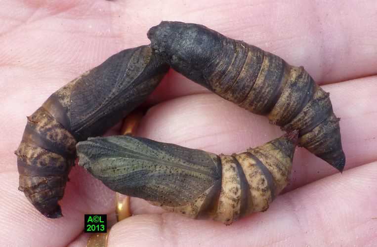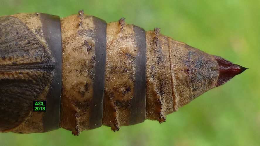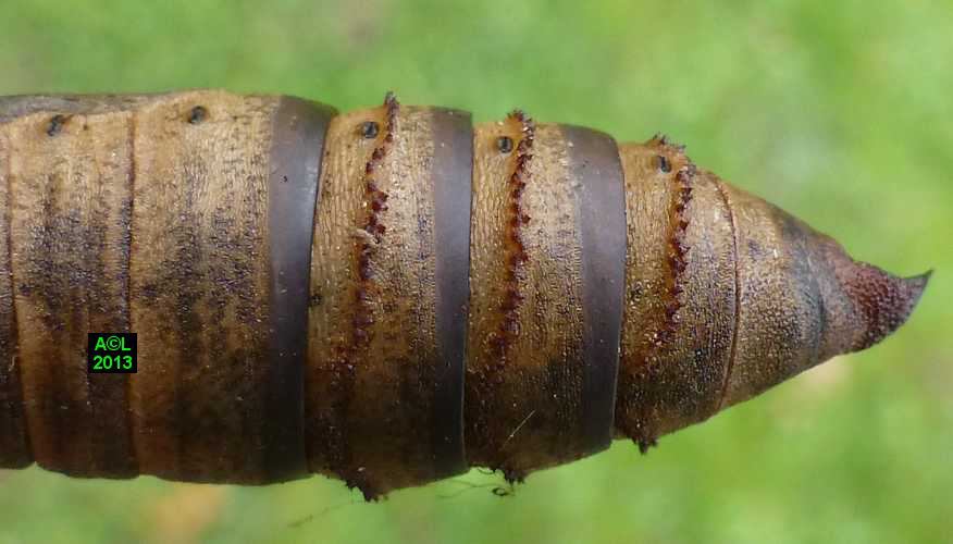 Vous noterez que ces couronnes dentelées sont interrompues ventralement, mais surtout qu'elles sont très comparables à celles des chrysalides de la sésie apiforme (Sesia apiformis, voir site) ou encore du Cossus gâte-bois (Cossus cossus, voir site). Pour mémoire, ces chrysalides sont "outillées" pour pouvoir percer leurs robustes cocons boiseux, les couronnes dentelées (présentes sur tous les segments) leur permettant ensuite de migrer à l'air libre, peu avant l'éclosion du papillon. Généré par les contorsions et tortillements de la chrysalide, le déplacement est laborieux, passablement désordonné, et au final très modeste (au maxi 30 cm pour la Sésie) .... mais il est !