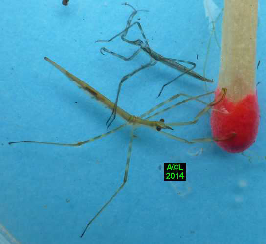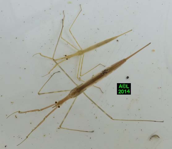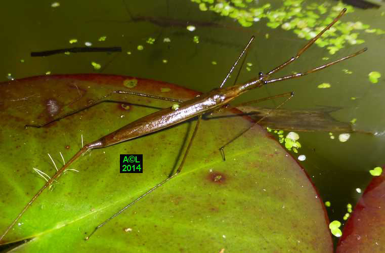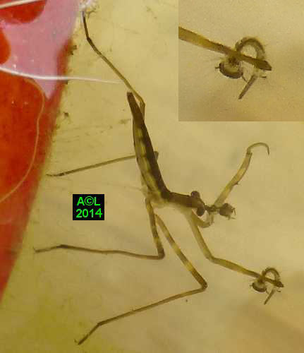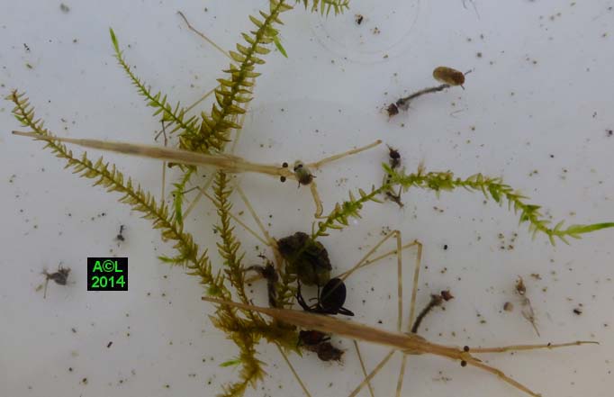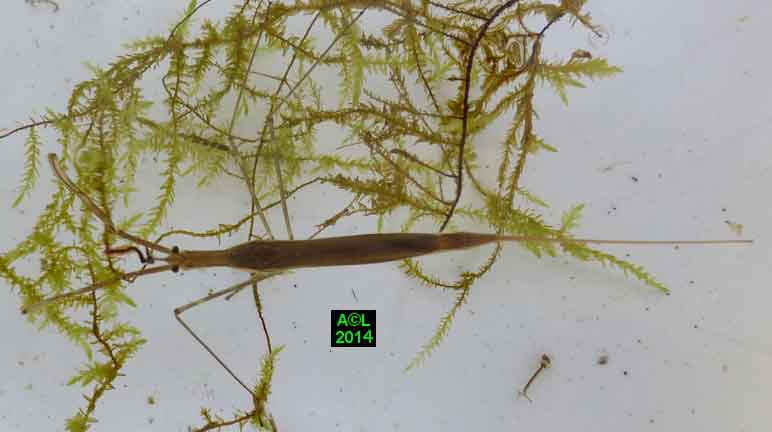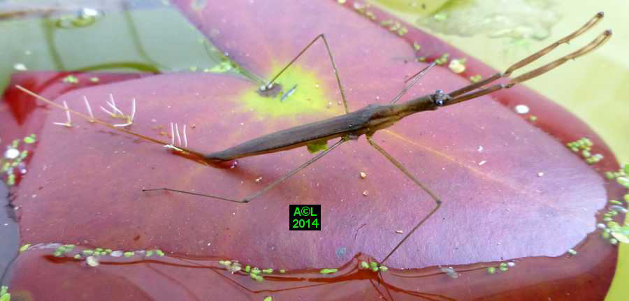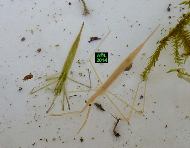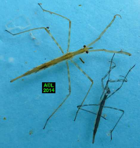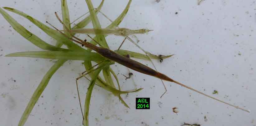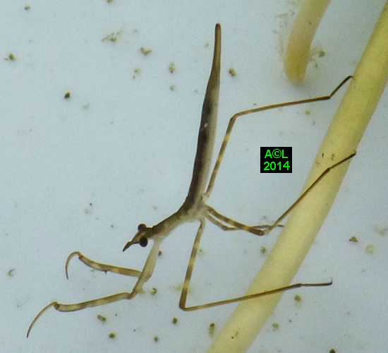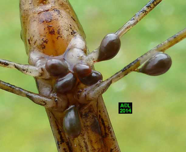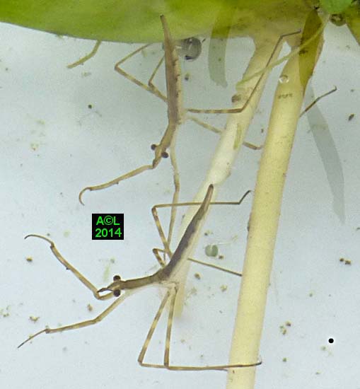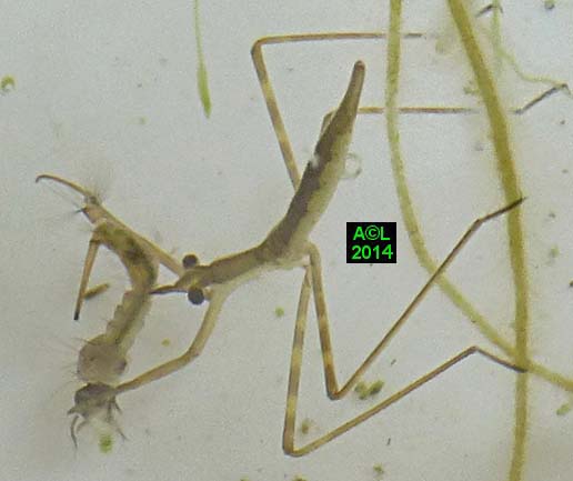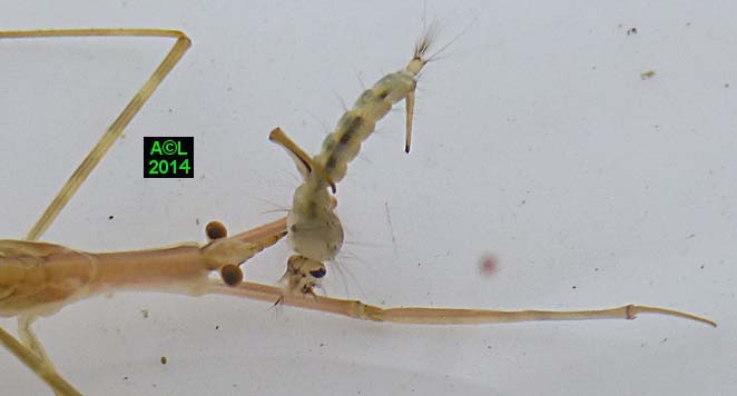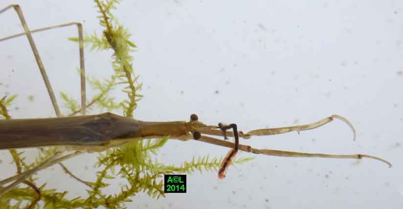 Pour redoutable qu'elle soit, la ranatre a bien sûr des ennemis, et si son mimétisme est précieux pour chasser, il l'est également pour éviter ... d'être chassée ! Par-delà les poissons carnassiers des plans d'eau de quelque importance, ou encore les grands dytiques et leurs larves peuplant la moindre mare, il faut aussi compter avec de minuscules et insatiables "suceurs de sang" ... et la ranatre ci-dessous en sait quelque chose !