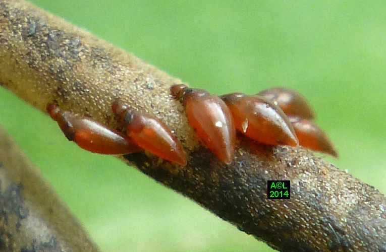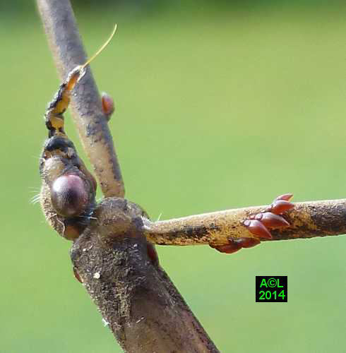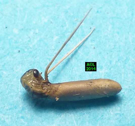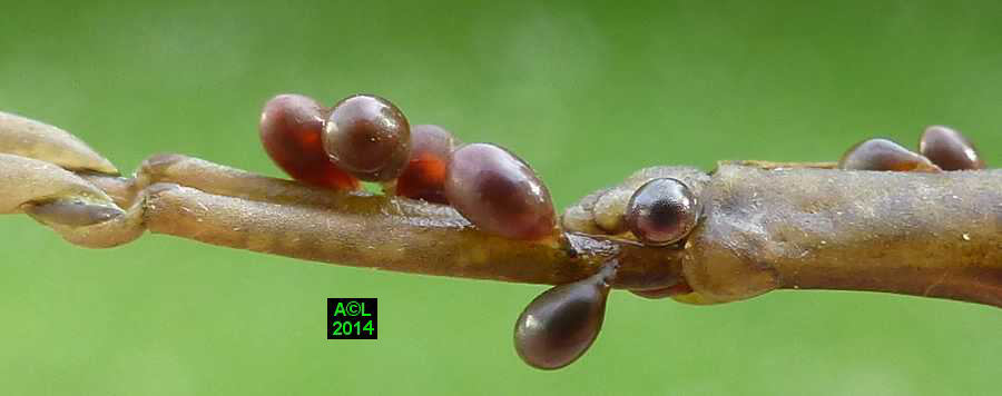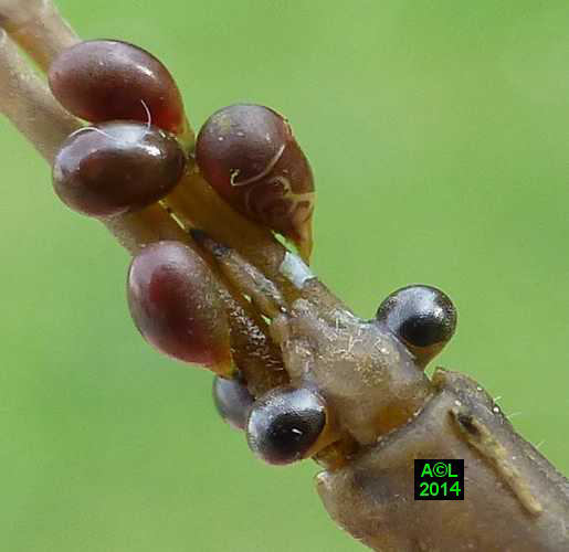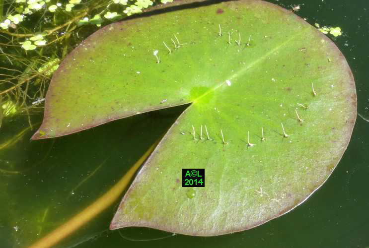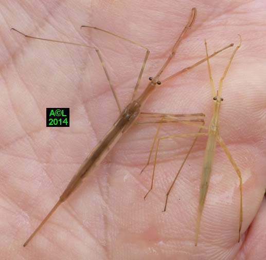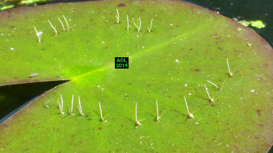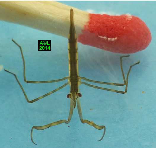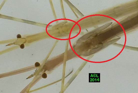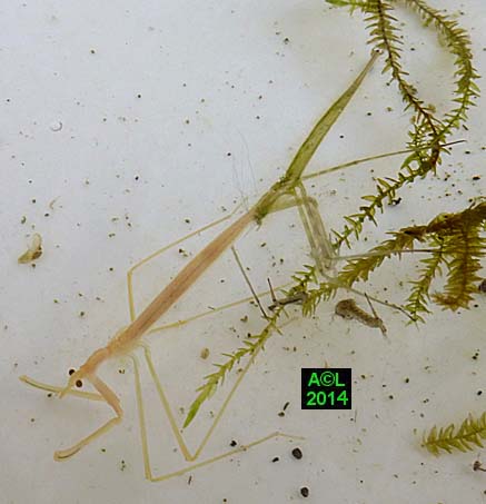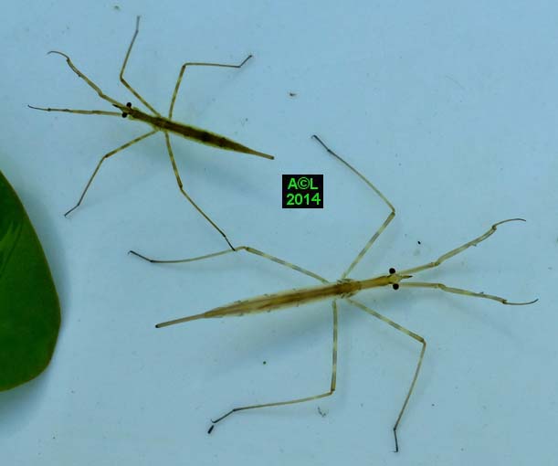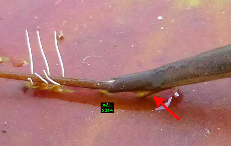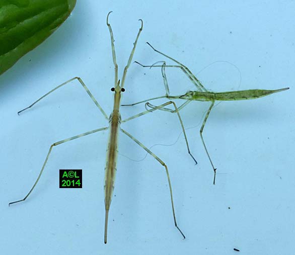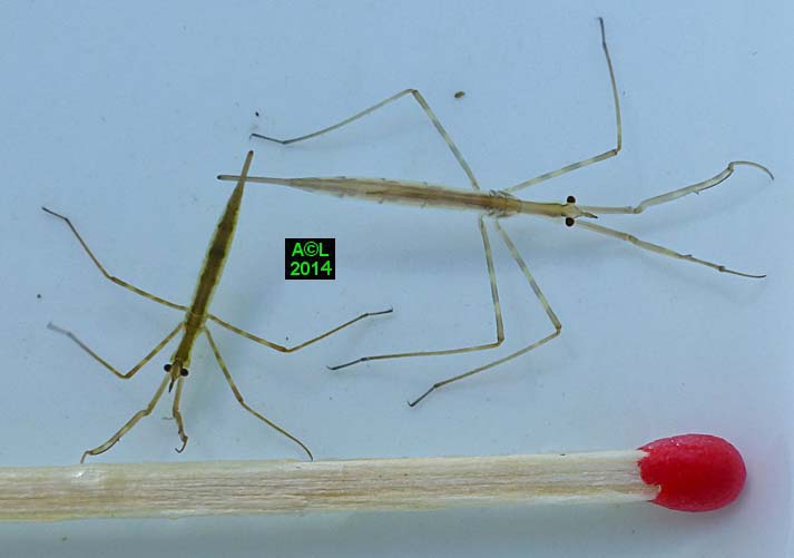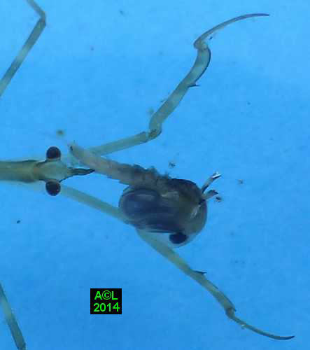 Pour redoutable qu'elle soit, la ranatre a bien sûr des ennemis, et si son mimétisme est précieux pour chasser, il l'est également pour éviter ... d'être chassée ! Par-delà les poissons carnassiers des plans d'eau de quelque importance, ou encore les grands dytiques et leurs larves peuplant la moindre mare, il faut aussi compter avec de minuscules et insatiables "suceurs de sang" ... et la ranatre ci-dessous en sait quelque chose !