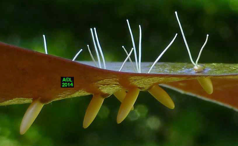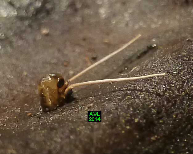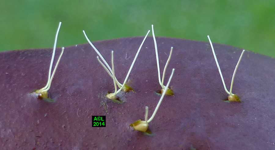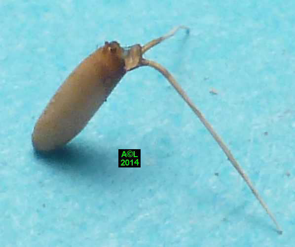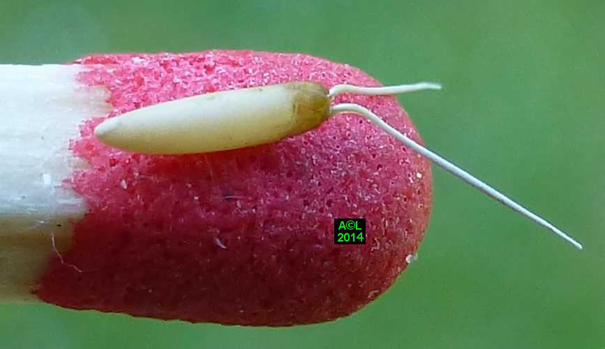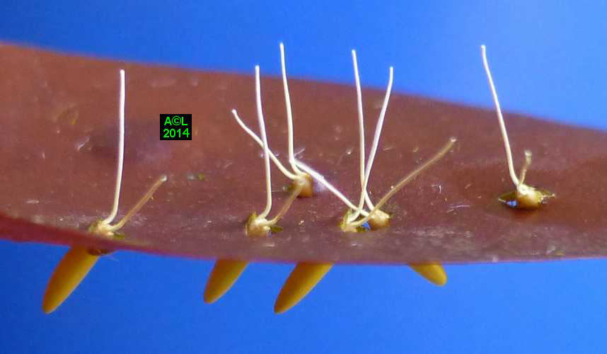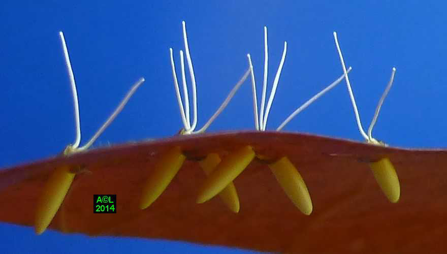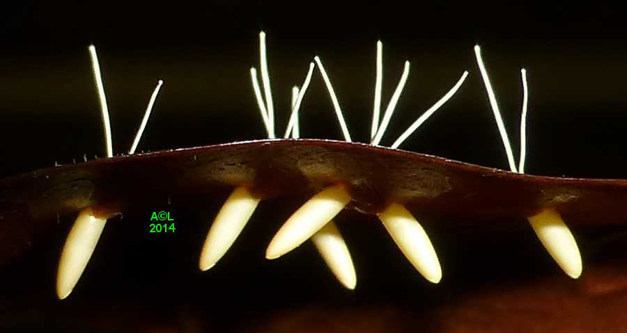 Vous noterez que les pontes rectilignes (= "en lignes" ! ) correspondent à la progression elle-même rectiligne de la pondeuse. Non moins logiquement la rotation de la bestiole (à la manière d'un compas) génère des pontes en arcs de cercles, voire quasi circulaires comme le "champ d'éoliennes" ci-dessus présenté. La lumière faisant très vite fuir la bestiole je n'ai pu multiplier les photos, et encore moins faire une vidéo ... mais comme vous le verrez je n'avais pas dit mon dernier mot !