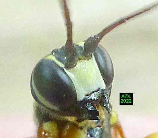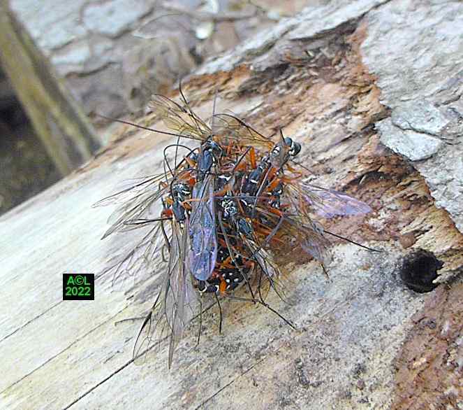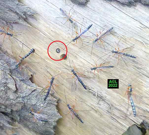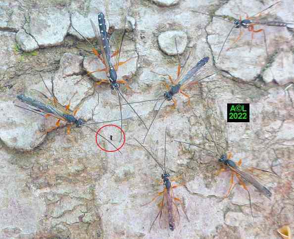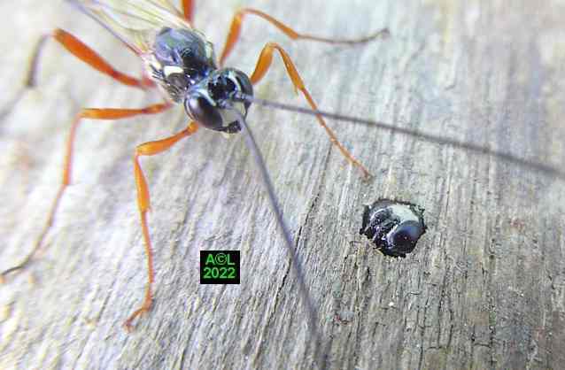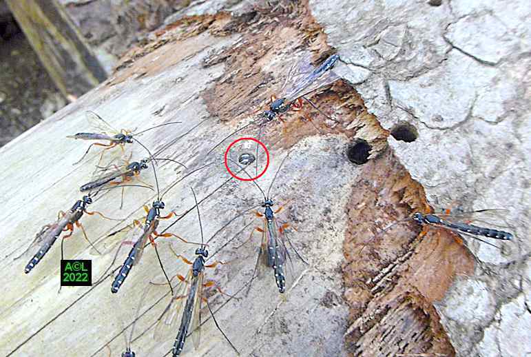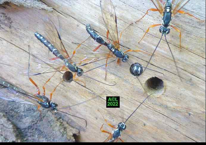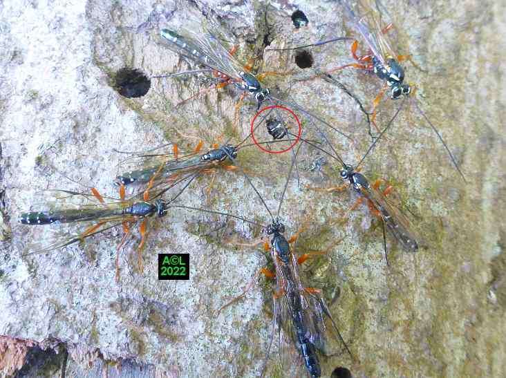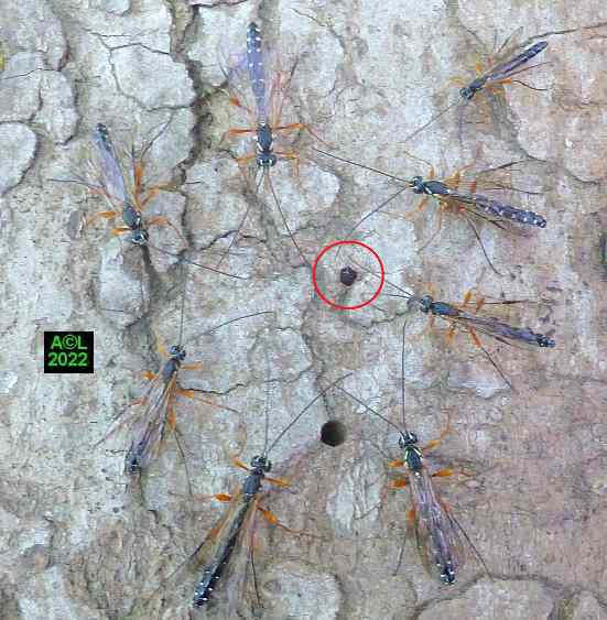 Alors que le percement du trou de sortie témoigne évidemment du quasi achèvement du processus de sclérification ( = durcissement des téguments ! ), la longue tarière des femelles reste au contraire aussi rigide qu'un brin de laine, ce qui lui permet de subir sans dommages la furia sexuelle des mâles, avant d'elle-même se sclérifier et d'ainsi devenir apte à forer le bois ... et y pondre !