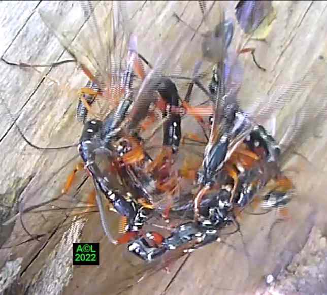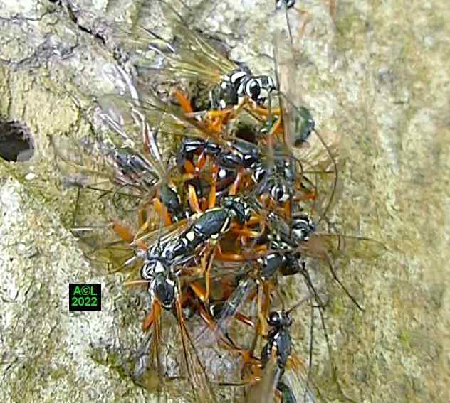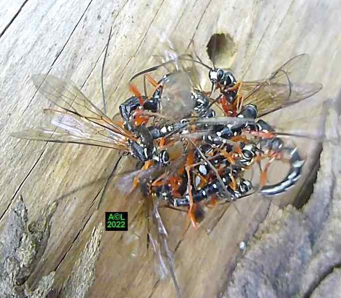 Face à tous ces mâles prêts à littéralement lui "sauter dessus" la femelle donne la nette impression de temporiser, tant elle semble hésiter à affronter une telle cour de prétendants à l'évidence "chauds bouillants". Quand elle se décide à sortir de son trou, ce qui peut demander "un certain temps" faute de déterminisme avéré, la ruée est alors immédiate. Il s'ensuit une mêlée pour le moins indescriptible, pouvant regrouper et même dépasser la dizaine de "concurrents". Il faut également compter avec des retardataires, s'efforçant avec plus ou moins de succès d'insinuer leur abdomen au cur de la grouillante effervescence ... en l'espoir ( le plus souvent vain ! ) de faire mieux que simplement participer !