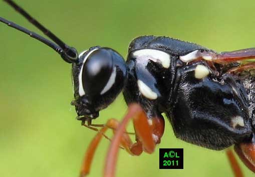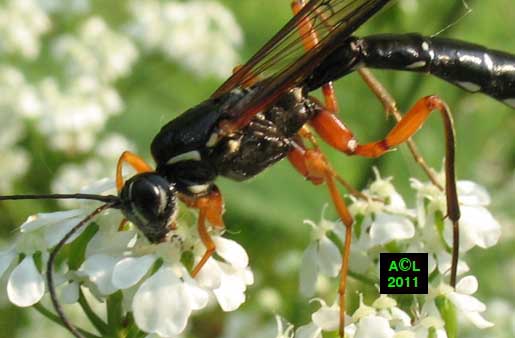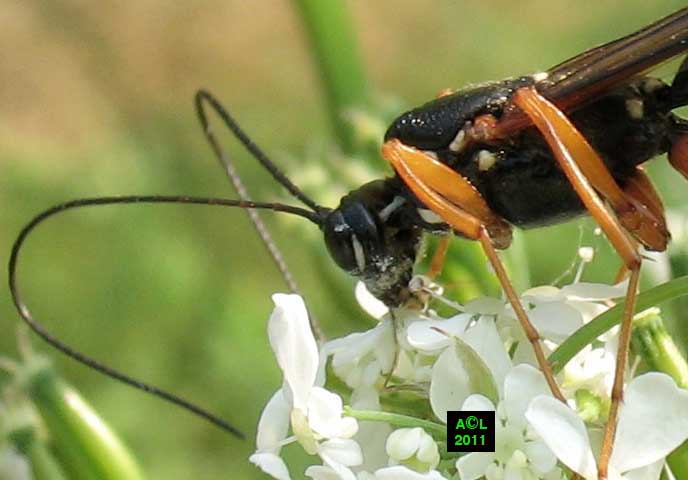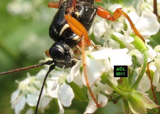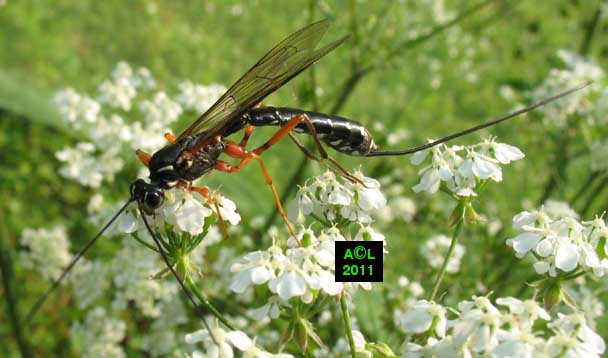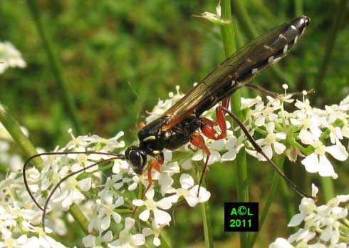 De très nombreuses espèces d'insectes apprécient les inflorescences des ombellifères, et les Rhysses en font partie, comme les illustrations ci-dessous le montrent. Vous noterez que ces bestioles sont du genre à "mâchouiller", plutôt qu'à butiner !