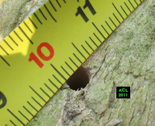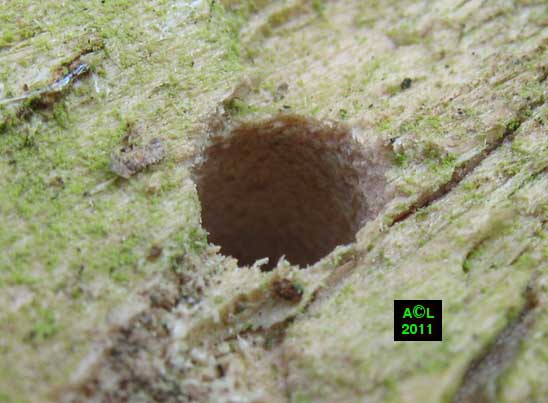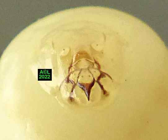 Le moment venu la rhysse devenue adulte va gagner l'air libre, là aussi à coups de mandibules. Concernant ces dernières la larve du sirex est manifestement bien dotée, leur forme pouvant se qualifier de classique. A contrario la larve de rhysse est simplement pourvue d'une sorte de croc triangulaire, a priori peu adapté au forage. Suite à un respectable volume de bois débité, et aux multiples galeries et cocons ainsi mis à jour, il a bien fallu me rendre à l'évidence, et donc attester d'une adéquation au forage de prime abord peu évidente.