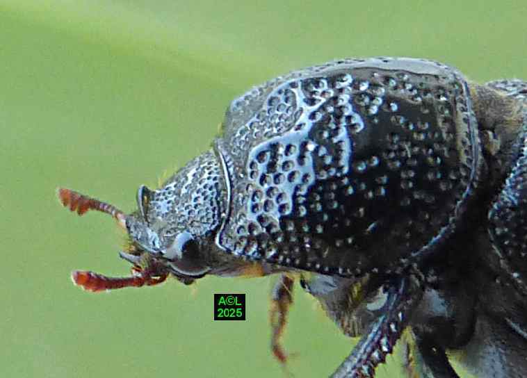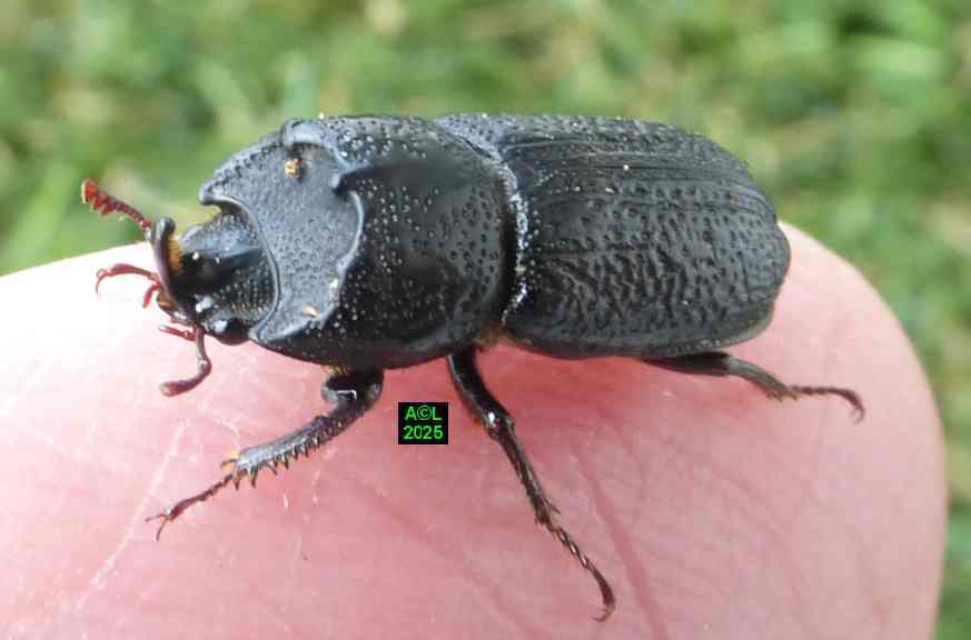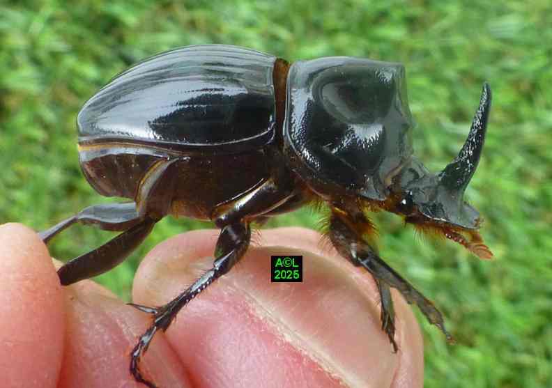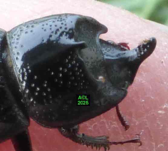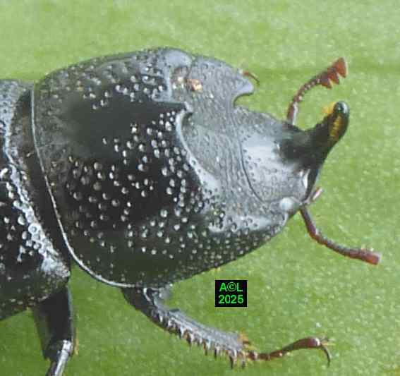 Vous noterez l'adaptation du mâle au creusement des bois dégradés, mais aussi son aptitude à regrouper et amalgamer les fragments boiseux en résultant. Du fait de sa position céphalique la mobilité de la corne est évidemment aisée, et sa pointe semble se comporter telle une gouge de menuisier, dont elle rappelle la forme. D'autre part l'arrière de la corne des "sino" est nettement aplani, et de part et d'autre rebordé par un alignement légèrement surélevé et grossièrement dentelé. En outre, la moitié antérieure de cette même corne est flanquée de 2 étroites gouttières garnies d'une pilosité roussâtre, peu dense et relativement longue, pouvant se qualifier de "brosses", mais on ne peut exclure de possibles éléments sensoriels. A cela s'ajoutent la concavité thoracique (mode bulldozer !), et les 3 excroissances de son pourtour (2 latérales, 1 sommitale) lesquelles doivent pouvoir assurer l'ancrage et la stabilité de notre "sino" lorsque que la corne entre en action. Semblant peu adaptée à ces "grandes manuvres", la femelle pourrait se contenter d'emprunter les voies déjà tracées, afin d'y assurer son quotidien, tout en oeuvrant pour la pérennité de son espèce ! En fait elle peut bel et bien creuser, aussi lentement que sûrement ... mais elle creuse, ! (photos et vidéo faisant foi !).