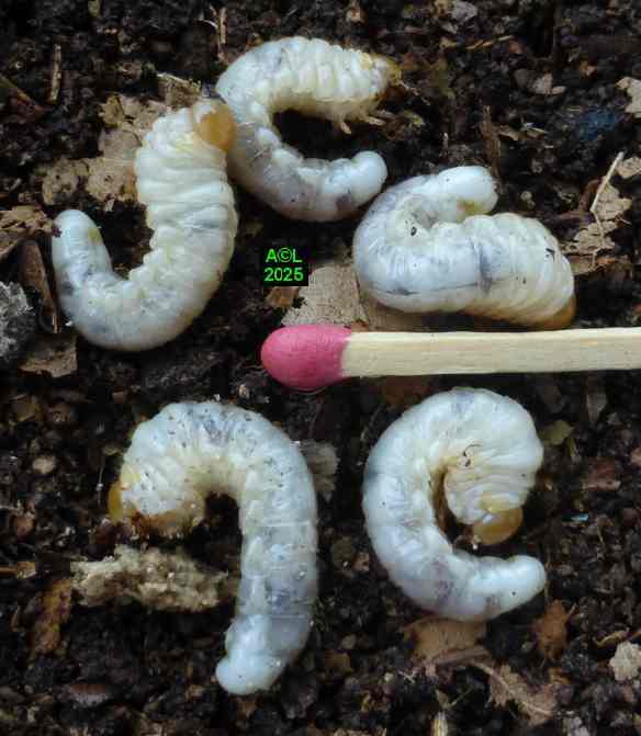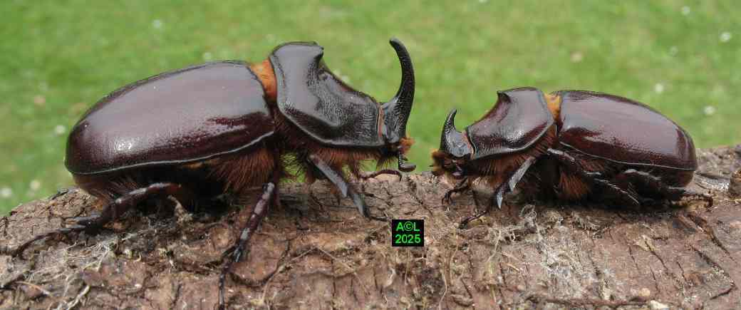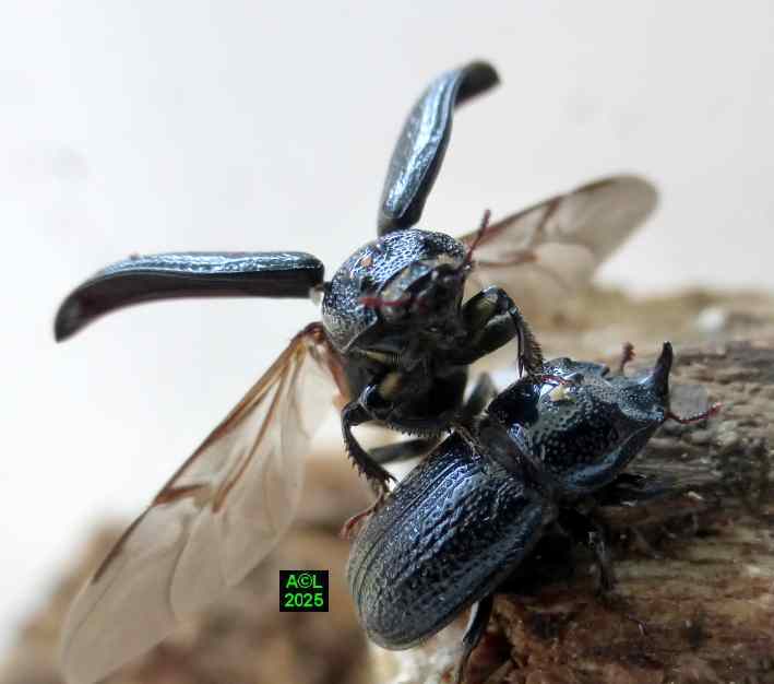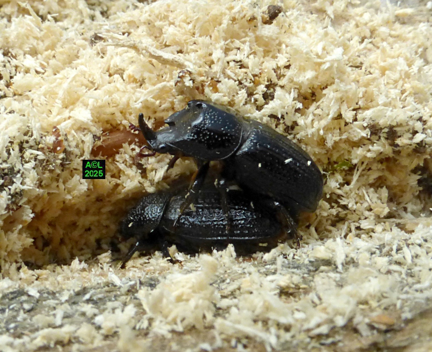 Vous l'aurez compris nos petits "sino" ne sont pas en reste, du moins le dit-on, car en dépit d'observations prolongées, et quotidiennes, je n'ai rien observé de comparable sur les 2 lots comportant chacun 3 couples. Je dirais même avoir constaté un intérêt très relatif pour les femelles, (hormis de rares et courtes velléités de poursuite), et n'avoir pu observer le moindre accouplement, du moins dans des conditions normales. Comme le fameux "Pique prune" (Osmoderma eremita) tout se passe, semble-t-il, "à l'abri des regards". Le creusement des galeries permet en effet d'aménager des évidements suffisamment spacieux pour servir tout à la fois d'arène et de "copularium", où les pudiques bestioles ont tout loisir pour s'exprimer. J'ajouterais que les bestioles en question ont été prélevées peu avant leur émergence (re-merci Stéphane ! ) d'où la certitude que "tout" s'est passé entre mes "4 murs".