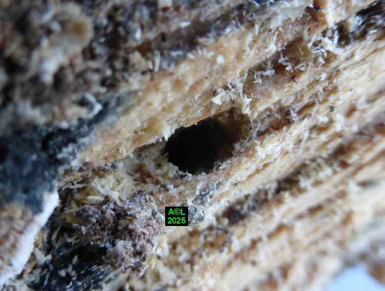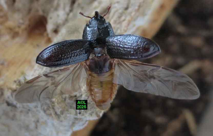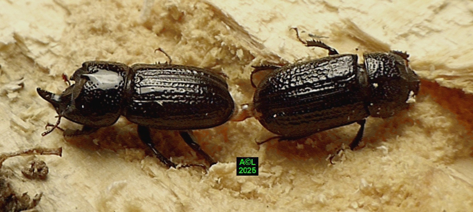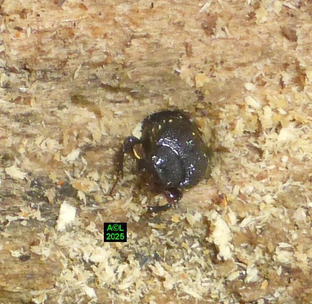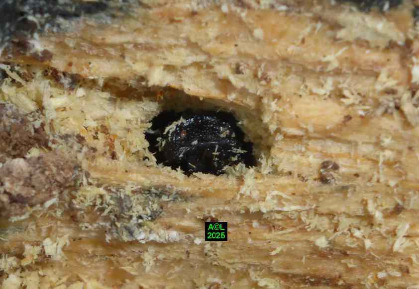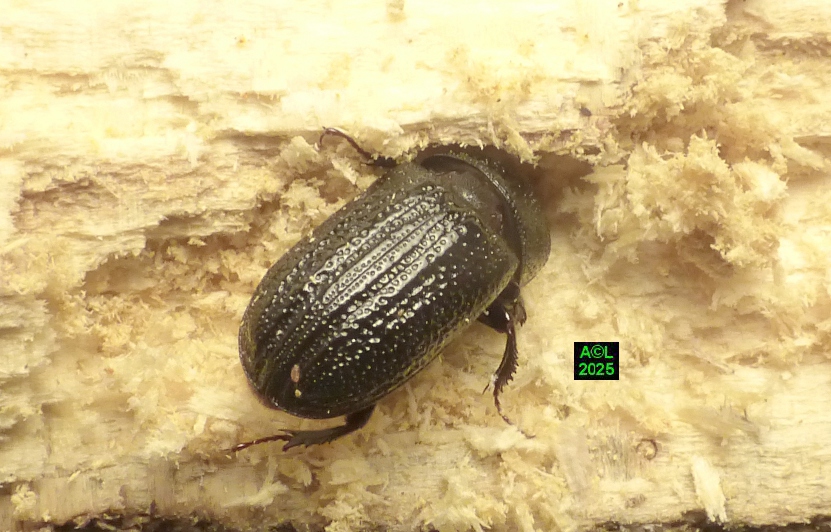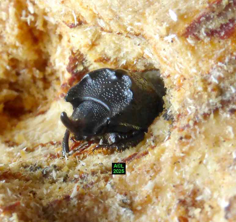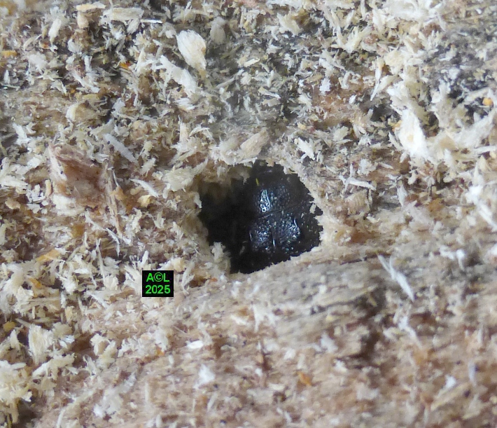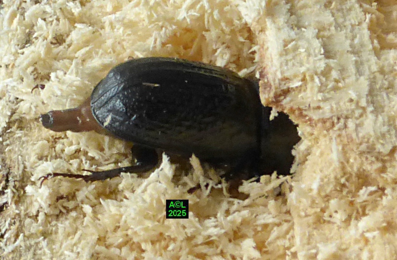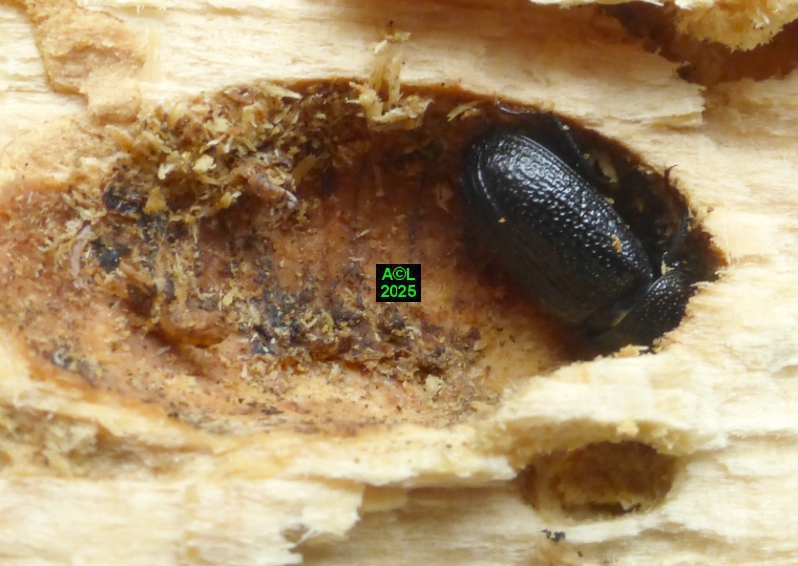Contrairement à ce que l'on peut lire et relire sur le web, les murs nocturnes de Sinodendron cylindricum me posent question. De fait, et j'ai eu tout loisir de le constater durant plus de 2 mois, la noire bestiole sort de sa retraite l'après-midi, souvent en seconde partie, et son activité donne lieu à de classiques "scènes de vie". Les envols sont également fréquents, et répétitifs, avec attirance très marquée pour la lumière du jour et le vitrage de mon séjour ! La nuit venue, crépuscule compris, les "sino" restent invisibles, mais au sein du bois l'activité dans les galeries doit plus ou moins se poursuivre à en juger par les déblais évacués sous la forme de minuscules copeaux.