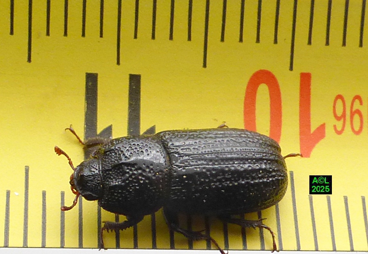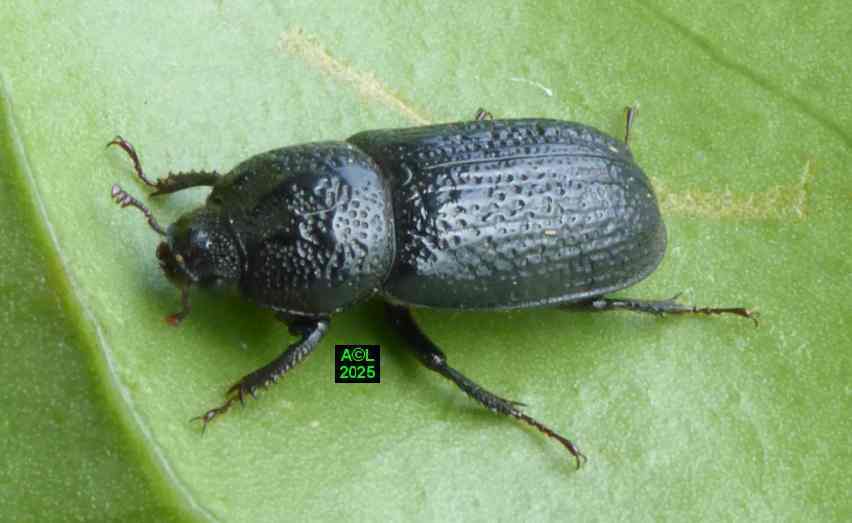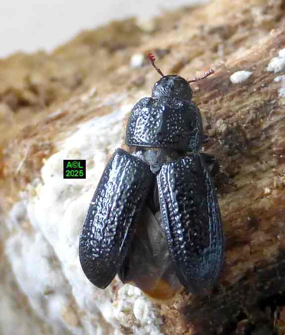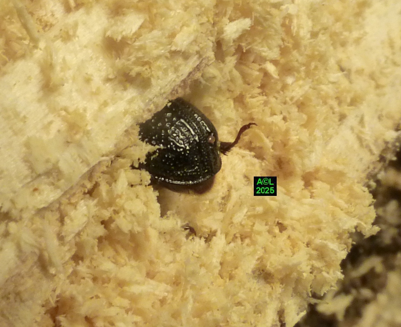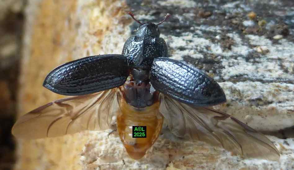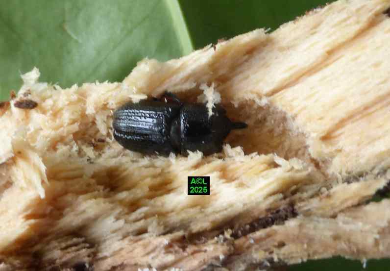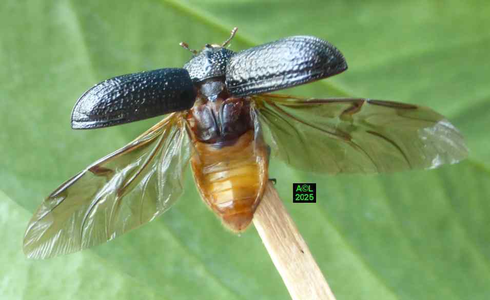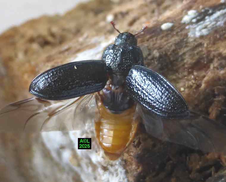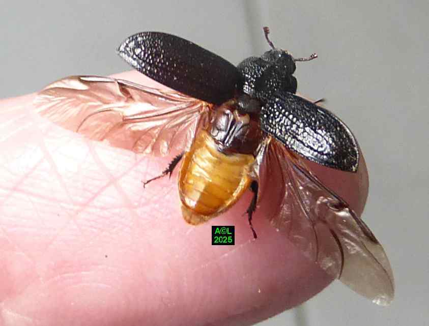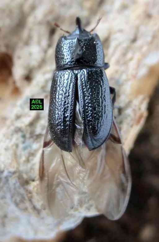 Contrairement à ce que l'on peut lire et relire sur le web, les murs nocturnes de Sinodendron cylindricum me posent question. De fait, et j'ai eu tout loisir de le constater durant plus de 2 mois, la noire bestiole sort de sa retraite l'après-midi, souvent en seconde partie, et son activité donne lieu à de classiques "scènes de vie". Les envols sont également fréquents, et répétitifs, avec attirance très marquée pour la lumière du jour et le vitrage de mon séjour ! La nuit venue, crépuscule compris, les "sino" restent invisibles, mais au sein du bois l'activité dans les galeries doit plus ou moins se poursuivre à en juger par les déblais évacués sous la forme de minuscules copeaux.