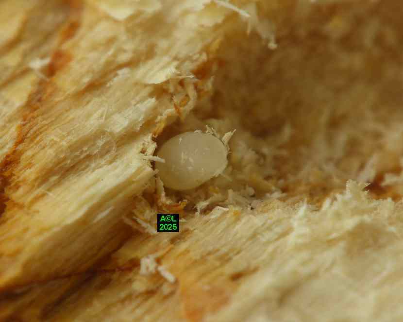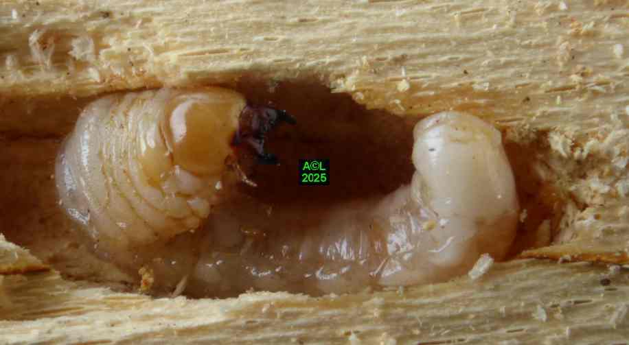Chez notre "sino" le bois ingéré par les larves étant fortement dégradé (d'où la notion d'insecte saproxylophages) le processus diffère, mais la finalité reste la même. De fait, chaque uf pondu se verra flanqué de levures qui rendront le bois en quelque sorte "comestible", tout en permettant à la larvule naissante de "s'ensemencer". Vous noterez que ce processus est commun à de nombreux insectes xylophages, et que ces levures sont stockées et dispensées via un organe idoine appelé "mycangium".