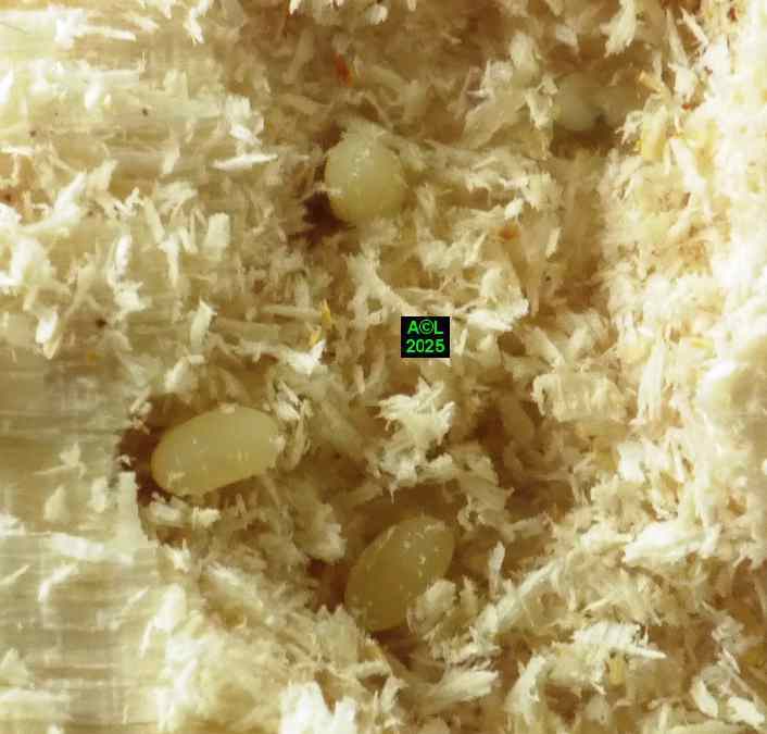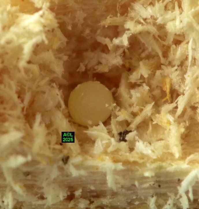 Chez les insectes les femelles peuvent parfois prendre soin de leur progéniture, à l'image du fameux perce-oreille qui d'ailleurs n'a jamais rien percé ! A contrario les mâles se bornent le plus souvent à "l'essentiel", mais là encore les "sino" témoignent d'une belle originalité. De fait, et aussi étonnant que cela puisse paraître, le mâle "monte la garde" à l'entrée de la galerie où la femelle est à l'uvre. Les oeufs sont le plus souvent émis dans un "cul de sac" de galerie, mais de courtes dérivations sans issues sont toutefois possibles. Dans tous les cas (comme les illustrations le montrent !), les ufs sont déposés au sein de fins copeaux peu densément amalgamés, là où la très parcellaire littérature fait état de "cupules en spirales" (sic) disposées le long de la galerie de ponte.