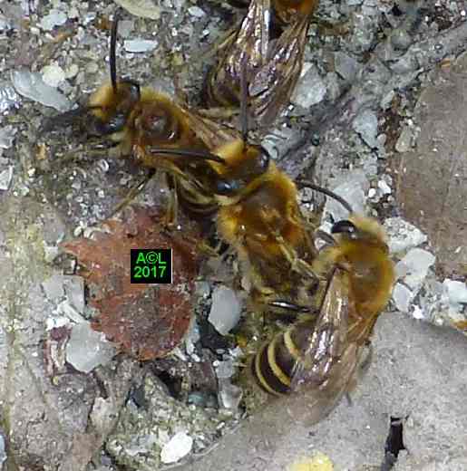 Ce premier "sondage" a eu lieu à le 10 Avril, et pour éviter de fausser la donne les fouilles ont été réparties sur 5 "bourgades" différentes. En raison de la fragilité des cellules, et d'un sol rendu compact par les ans et l'abondance des pluies, la "casse" était aussi inévitable qu'importante. Sur les 60 cellules ainsi trouvées, 42 ont plus ou moins "souffert", et sur ces dernières 12 se sont avérées parasitées. Il s'ensuit un taux de 28,6 %, certes élevé, mais néanmoins très en deçà de ce qu'il pourrait être, d'où une probable capacité des abeilles femelles à éliminer une partie des parasites ( les moins "futés" ? ou rapides ? ) lors de la nidification.
