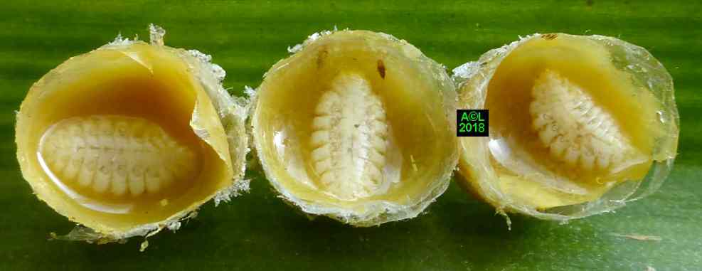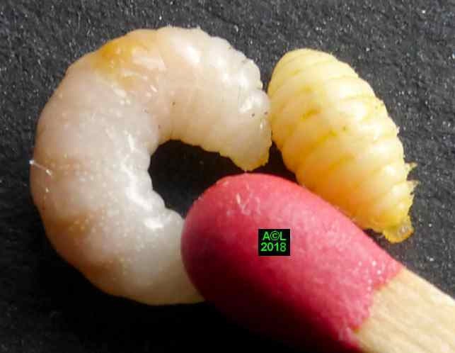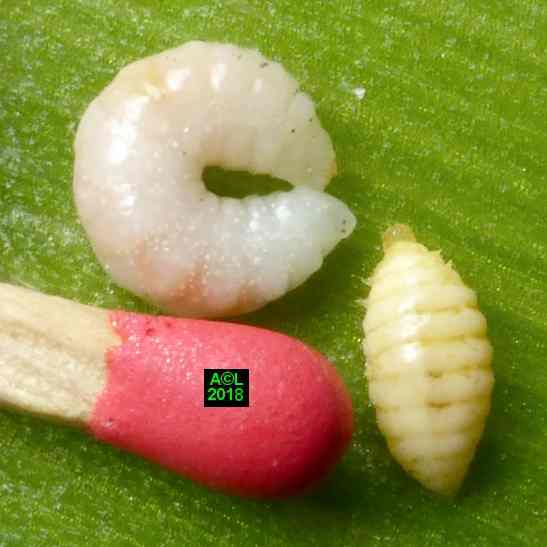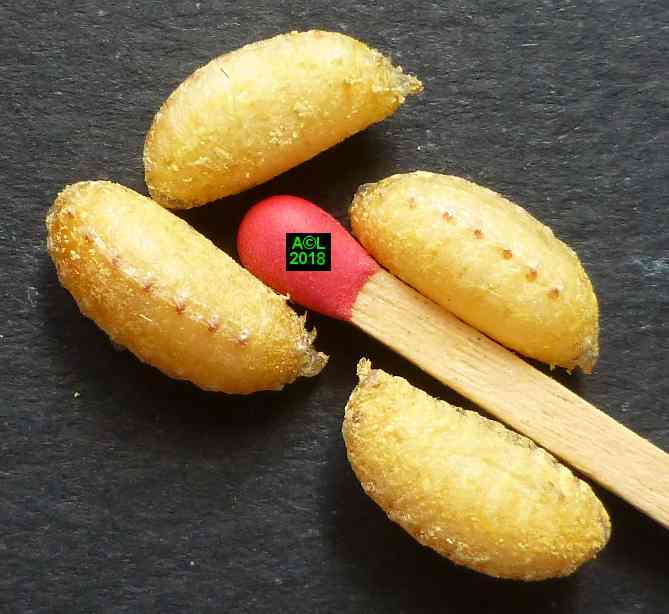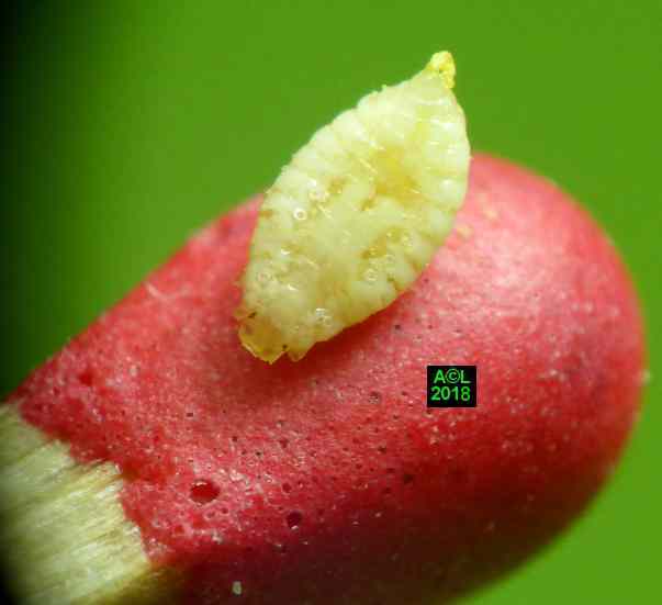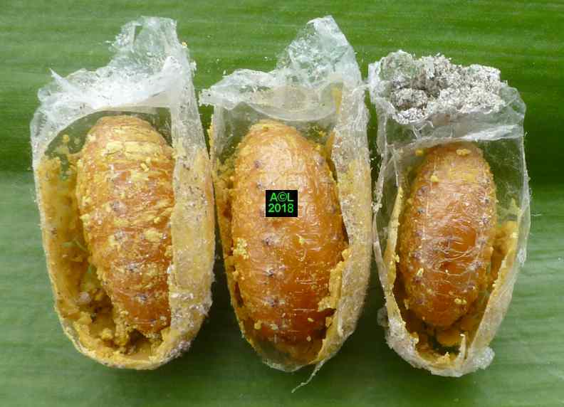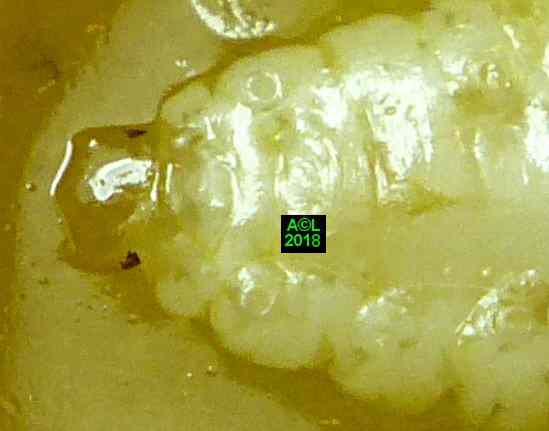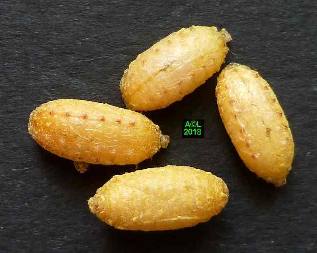 Dans le cadre du suivi larvaire de S. analis, un énième "raid" sur le site d'Abbaretz ( le premier datant d' Août 2017 ! ) m'a permis de "récolter" 10 cellules parasitées (sur 28) toutes issues d'une même "bourgade". Les "garde-manger" vides, la totale immobilité des larves parasites (à 2 exceptions près), et leur position verticale, tête en haut, m'ont de suite alerté. Après extraction et "toilettage" (des crottes plus ou moins desséchées et fragmentées restant çà et là collées) les pseudonymphes se sont avérées formées, hormis les exceptions précitées.
