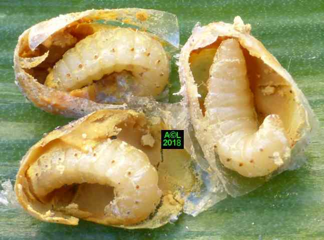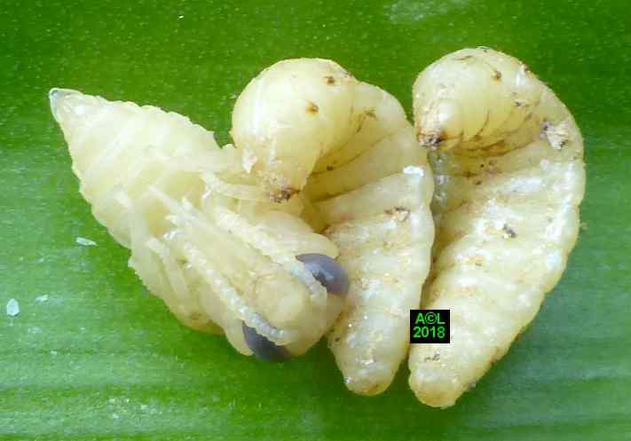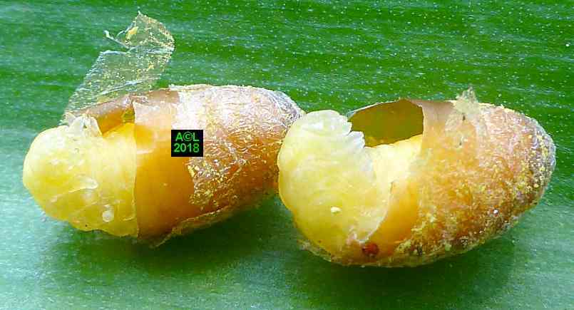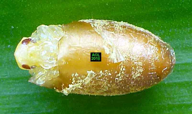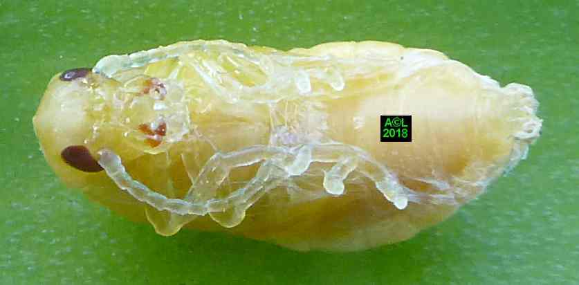 Déjà bien peu banal du fait de son hypermétabolie (se traduisant je le rappelle par 2 stades post-larvaires surnuméraires), le développement de S. analis se singularise également par la brièveté du stade prénymphal. Le plus souvent il est en effet d'une huitaine de jours à domicile, et en ce mois de juillet caniculaire (2018) je ne serais pas étonné qu'il faille encore moins sur site, tant la nature du terrain et son exposition sont susceptibles de générer des conditions optimales.
