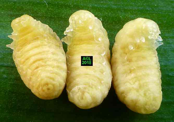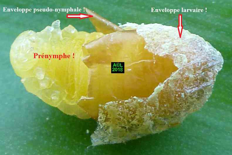 Moyennant le retrait (aisé) de l'exuvie larvaire il est non moins facile de déterminer la survenue de la prénymphe en jouant sur la relative translucidité de l'enveloppe pseudonymphale. En "mirant" cette dernière, comme on le fait pour les oeufs, il est de plus possible de repérer l'ébauche des pattes, et d'ainsi confirmer le statut prénymphal.