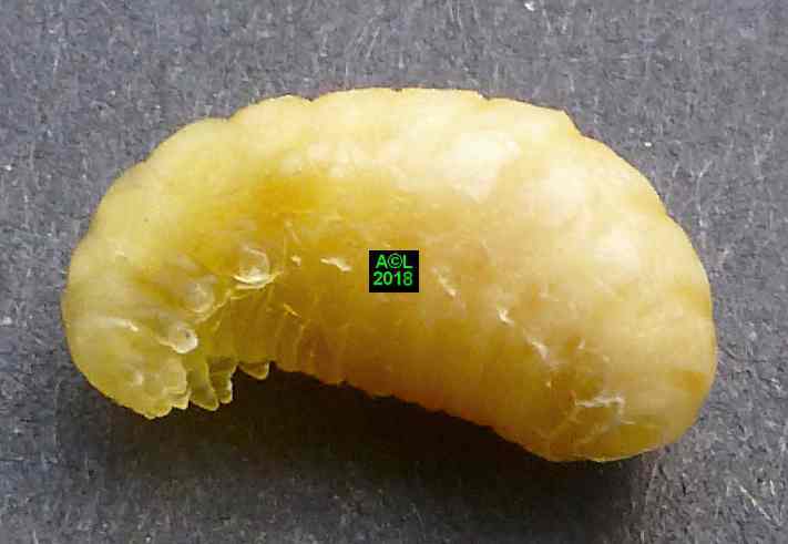 Découvertes dans un lot de cellules comportant des larves avancées, il m'a semblé logique de voir en ces prénymphes de futures Colletes, l'iconographie d'une publication universitaire hollandaise allant en ce sens. En fait, comme les images à suivre le montrent, il ne s'agit pas de Colletes en devenir, mais bel et bien de prénymphes d' "Epéolus à cuisses rouges" (Epeolus cruciger), abeille cleptoparasite dite "abeille coucou" !