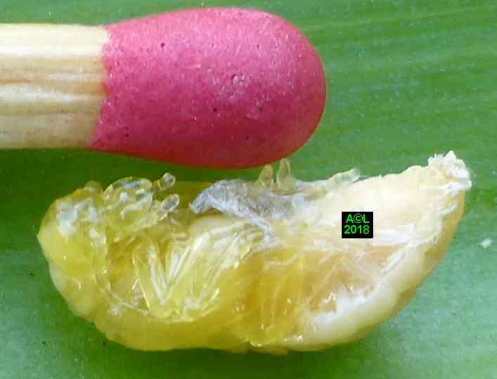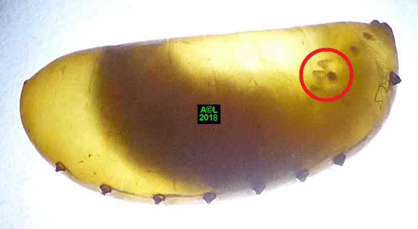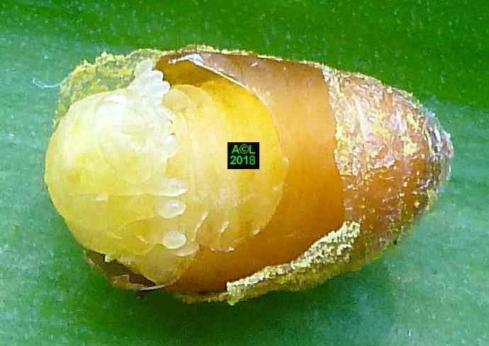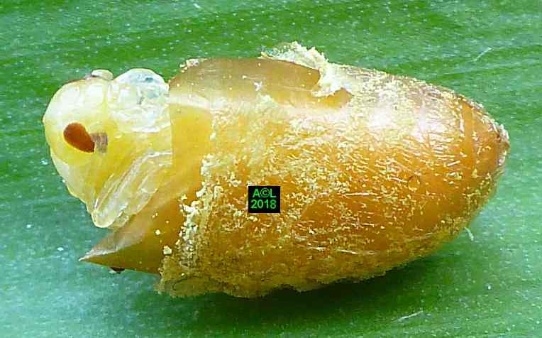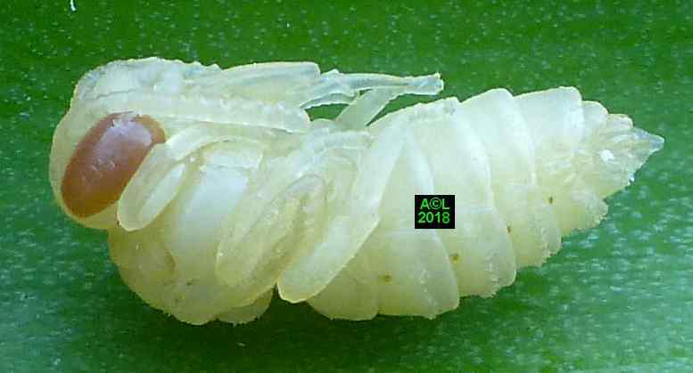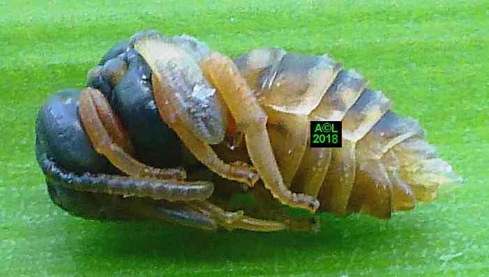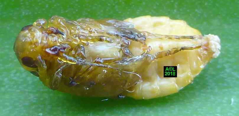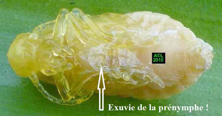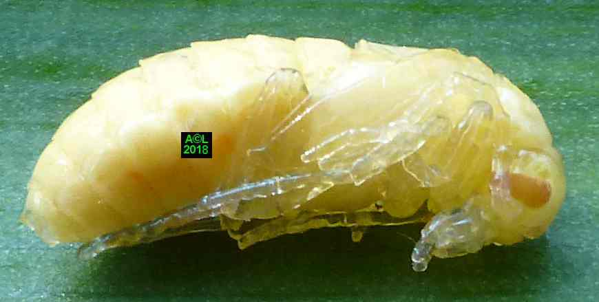 Maintenue en "élevage", une partie des pseudonymphes récoltées le 22 Mai m'a donné les premières prénymphes le 11 juillet. Comme les illustrations ci-dessous le montrent le terme de prénymphe est parfaitement explicite et judicieux, car les appendices (pattes notamment) sont à peine différenciés, et les étuis alaires (typique préfiguration de l'adulte), sont quant-à eux ... aux abonnés absents !