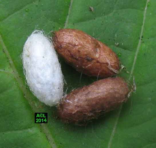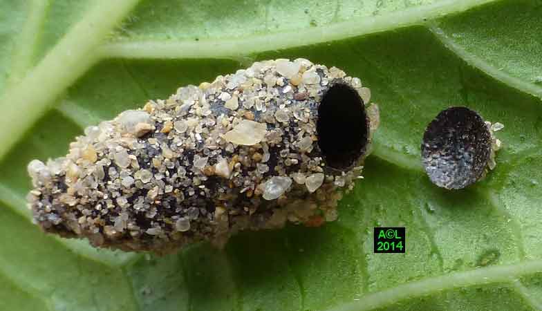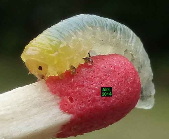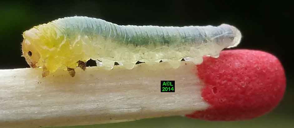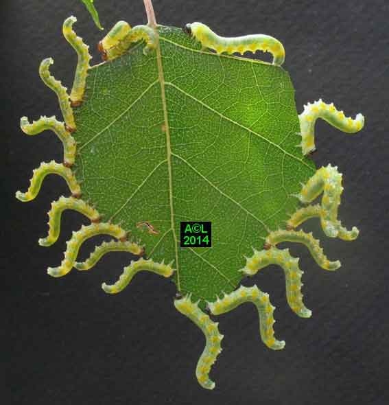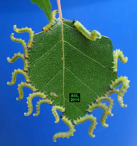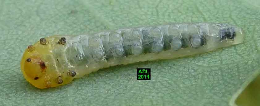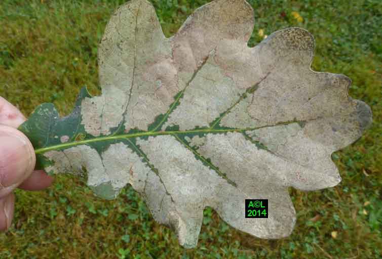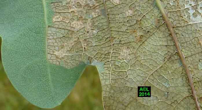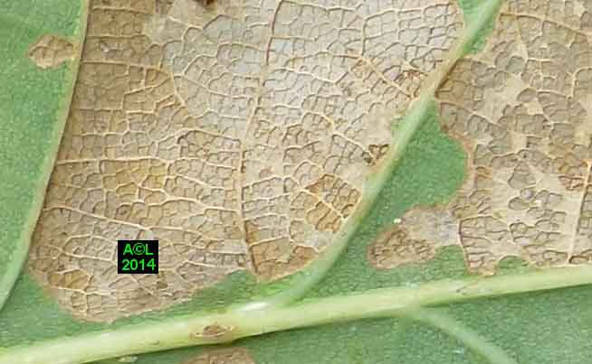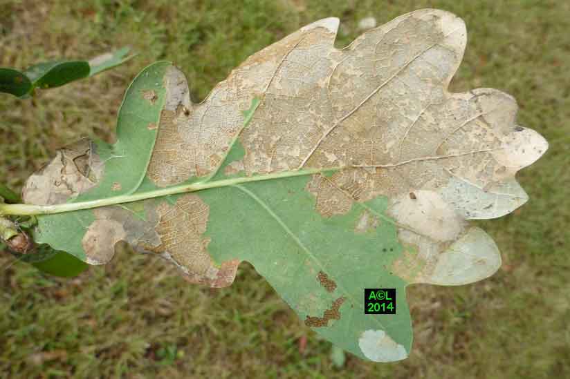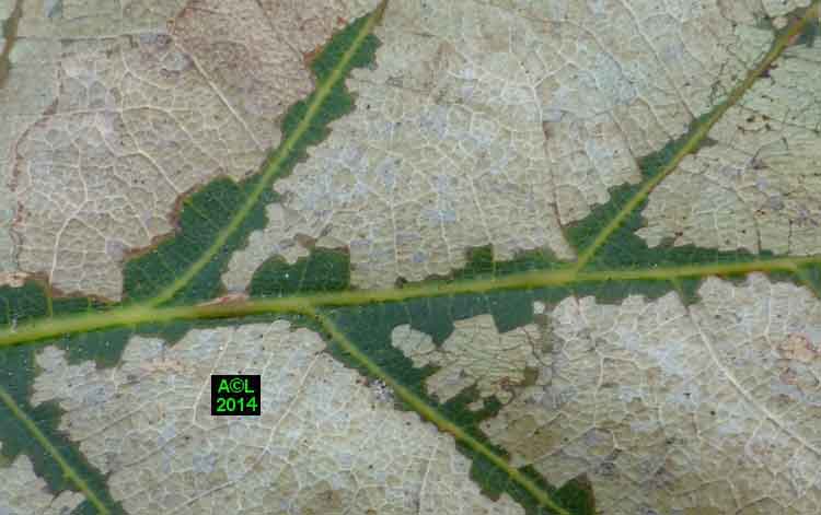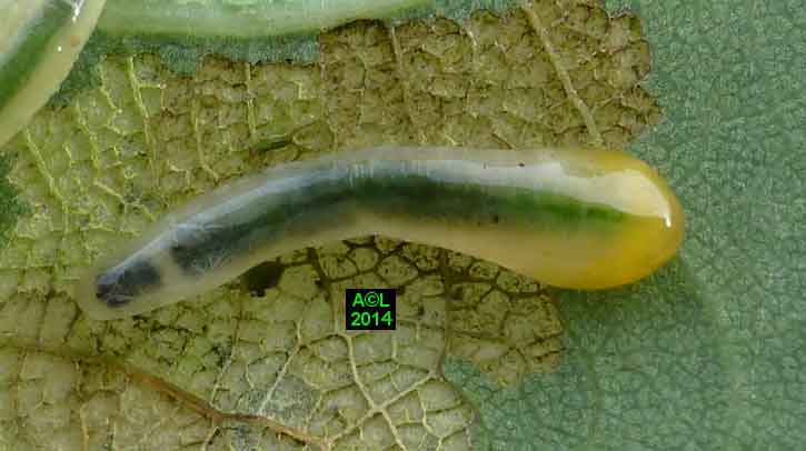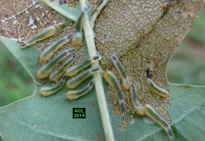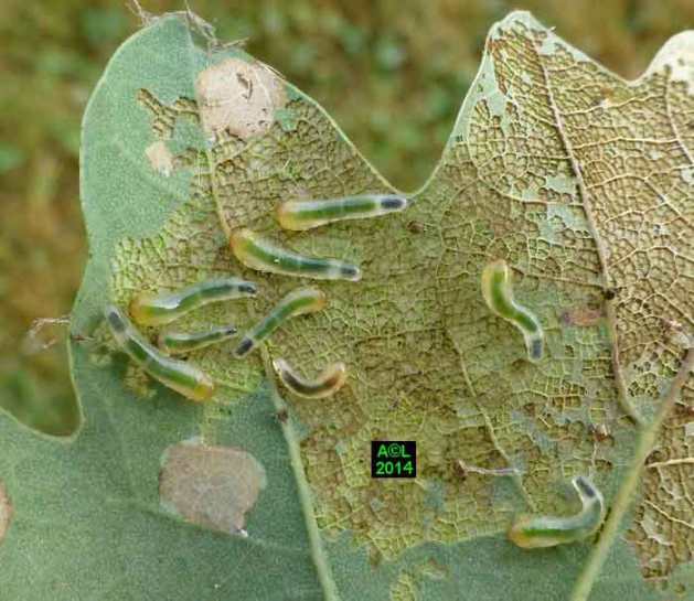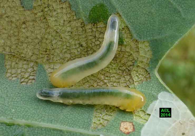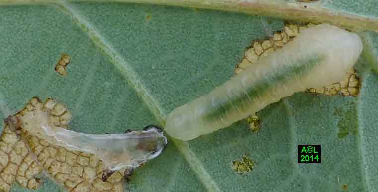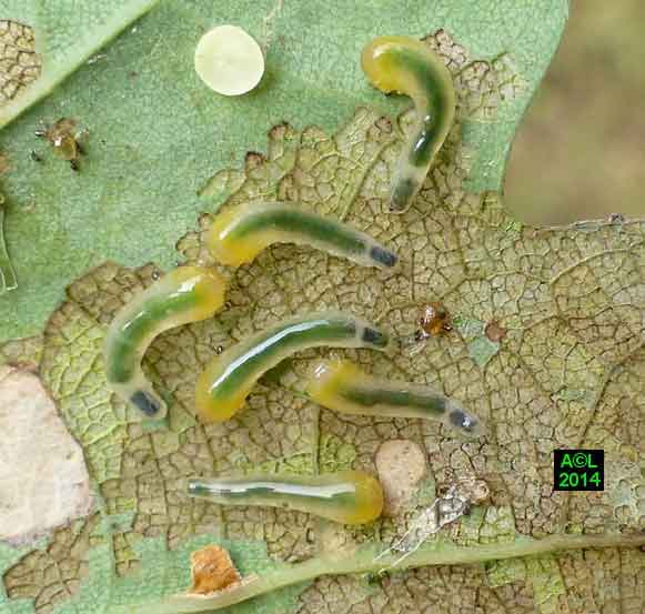 Appelée "Tenthrède limace" en raison de son aspect , Caliroa annulipes peut se rencontrer sur les chênes, mais aussi sur d'autres feuillus, y compris fruitiers. Une espèce voisine, Caliroa varipes, reconnaissable à sa tête noire, est quant à elle inféodée aux chênes. Ces tenthrèdes se contentent, si je puis dire, de typiquement "brouter" les épidermes foliaires, et vous verrez qu'elles fonctionnent recto / verso ... comme les photocopieuses !