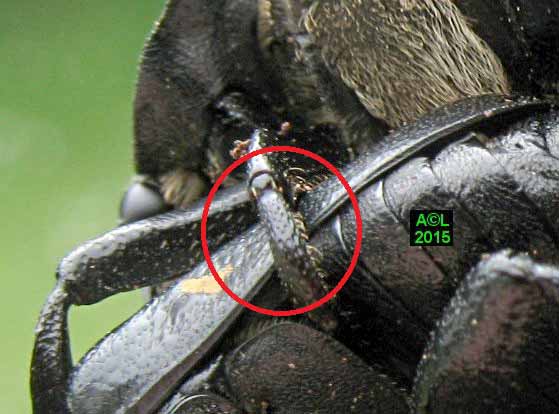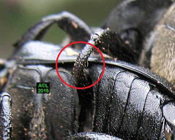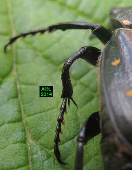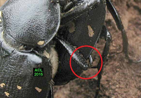 Il est bien marqué, encore faut-il savoir où regarder car il ne siège pas forcément là où on l'attend. En toute logique il est comparable à celui de Gnorimus octopunctatus, et à ce titre 3 zones morphologiques sont concernées, et ci-dessous illustrées. Vous noterez que le sillon abdominal des mâles est très marqué, alors qu'il est le plus souvent à peine ébauché chez octopunctatus. A l'inverse le "museau" ( clypeus ! ) du mâle des Verdets est souvent moins nettement retroussé, le risque de confusion se voyant illico dissipé ... via la patte des bestioles ! Loin de correspondre à une bizarroïde malformation, la très typique courbure de la patte intermédiaire des mâles de Gnorimus traduit au contraire une avancée disons ... "technologique" ! Lors de l'accouplement cette curieuse conformation permet en effet de parfaitement enserrer et maintenir la femelle, prévenant ainsi tout ... "délit de fuite" !