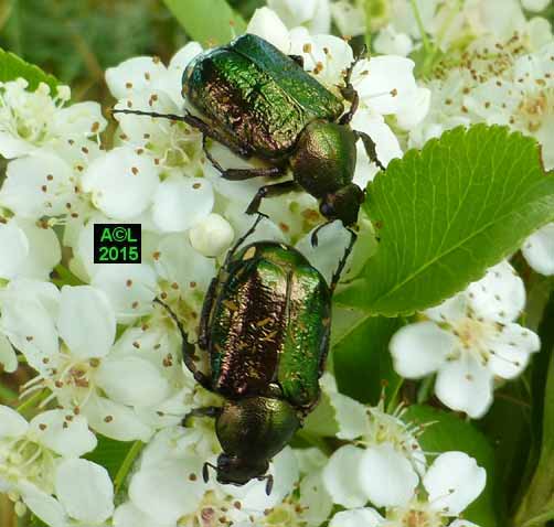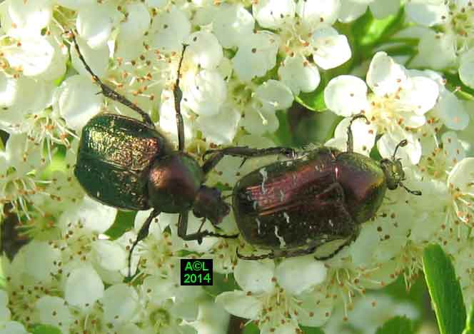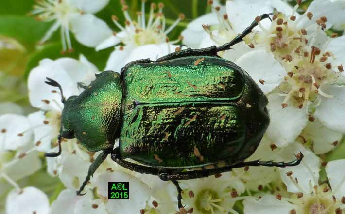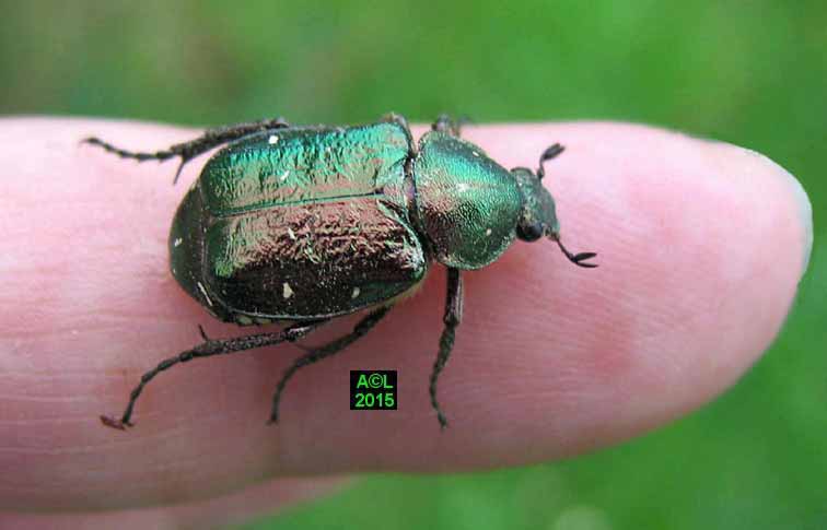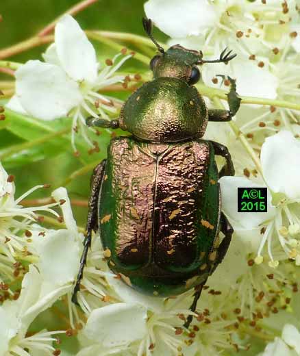 Là où son cousin est toujours vêtu de noir, le bien nommé Verdet peut se faire joliment cuivré. La silhouette des 2 espèces est par contre identique, et toutes deux portent des taches "café au lait" (avec plus ou moins de lait ! ) dont le nombre, la forme, et l'étendue, diffèrent pratiquement d'un individu à l'autre Schématiquement le Verdet se complait plutôt du centre au nord de la France, et a contrario l'octopunctatus est plutôt un hôte du centre au sud, avec une nette tendance montagnarde, mais il s'agit là de préférences, non de limites exclusives. Toujours au titre des différences le Verdet aime butiner au soleil, et jouer ainsi les "m'as tu vu", là où son noir homologue est un modèle de discrétion, au point de passer une grande partie de son temps quasi cloîtré au sein de ses gîtes larvaires, un peu à la manière du fameux Pique-prune, autre cousin ... plus éloigné !