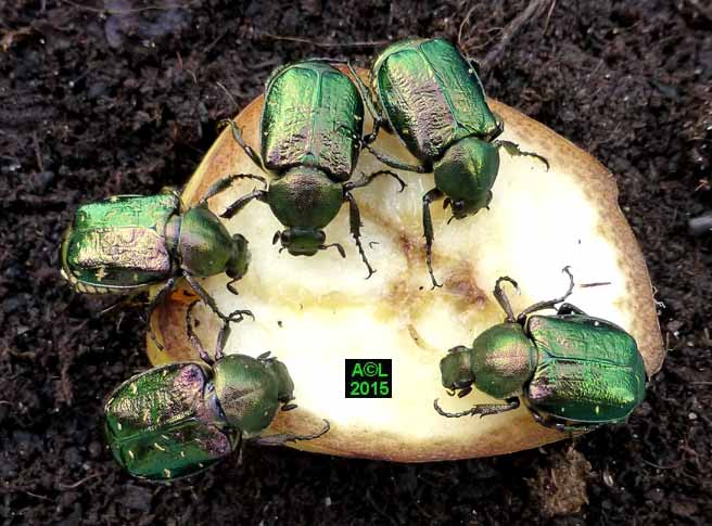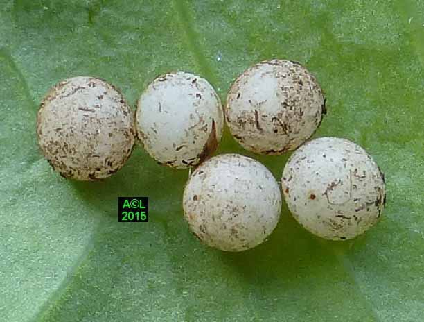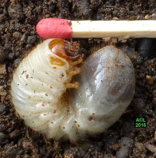 Après fécondation, comme il se doit, les femelles du Verdet s'enfoncent dans le substrat (terreau ou bois très dégradé), aussi profondément que possible, et les oeufs y sont déposés au sein de logettes individuelles. Il s'ensuit une bonne protection de la ponte, d'où un nombre d'oeufs relativement faible, de la même façon qu'une "casse" importante (prédation par exemple), est logiquement compensée par une ponte numériquement élevée. Faute d'avoir pensé à les dénombrer j'avoue ignorer la moyenne des oeufs pondus par ce Gnorimus mais je pense pouvoir la situer aux alentours d'une cinquantaine d'unités.
