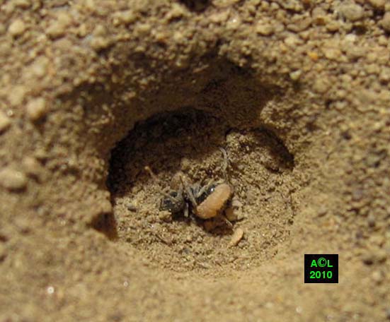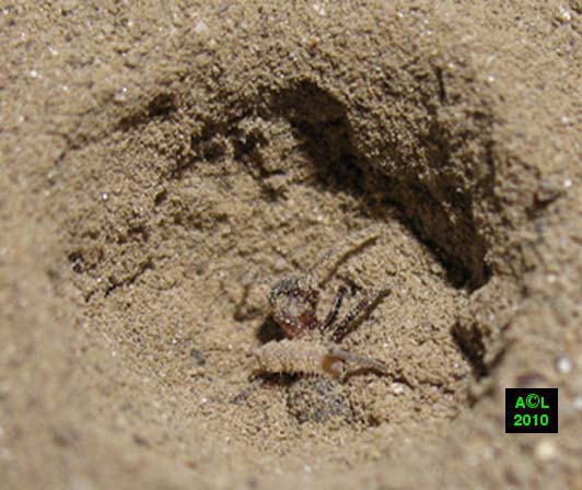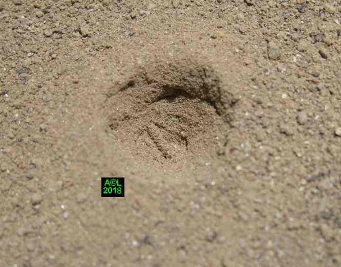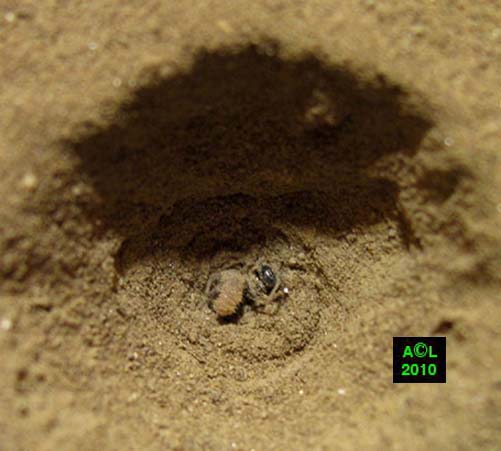 Replié sur lui-même l'avant corps forme une sorte de crochet, voire d'anneau plus ou moins fermé, où la tête fait office de pelle. En une fraction de seconde la bête plonge dans le substrat et en se relevant brusquement (comme sous l'effet d'un ressort), une "pelletée" de déblais se trouve éjectée et dispersée à la périphérie du futur piège. De la même façon que vous procédez avec une une miette de pain, la bestiole utilise le principe de la "chiquenaude" ainsi définie par le Larousse : "Coup donné avec un doigt replié contre le pouce et que l'on détend brusquement".