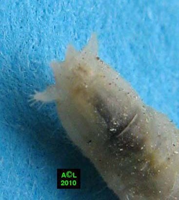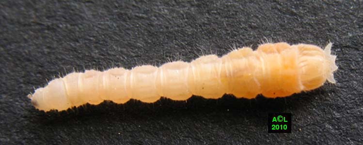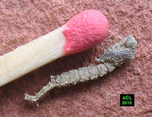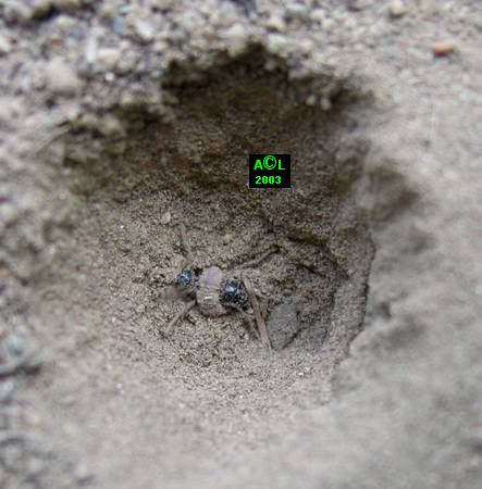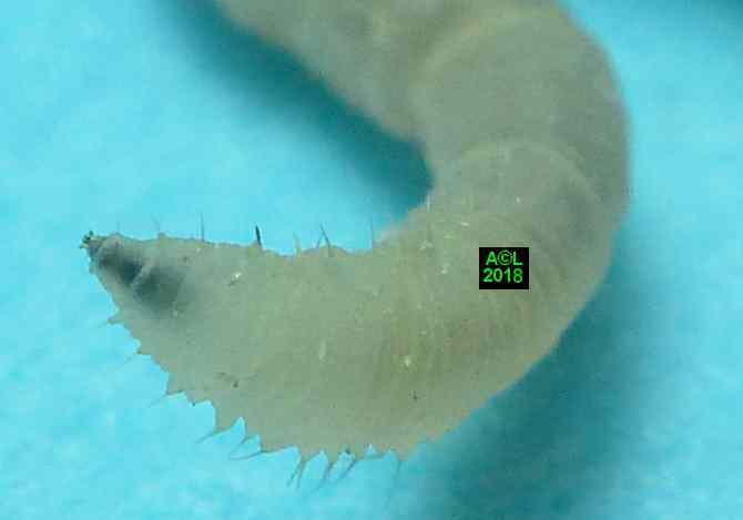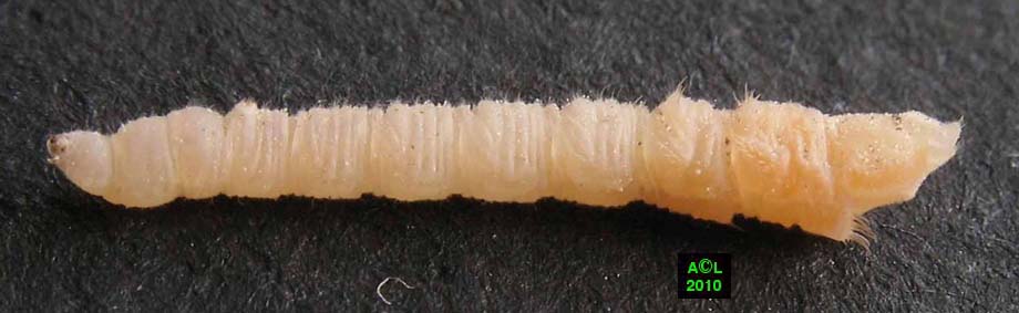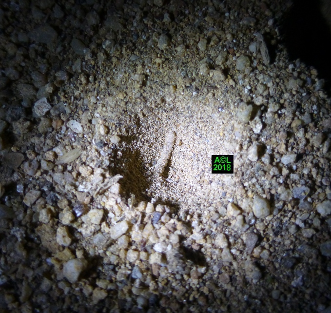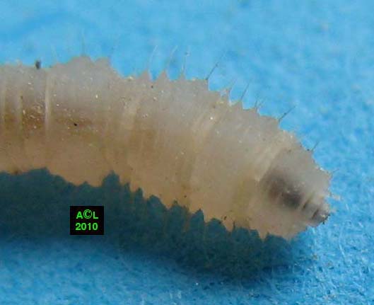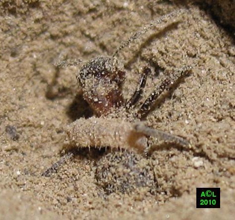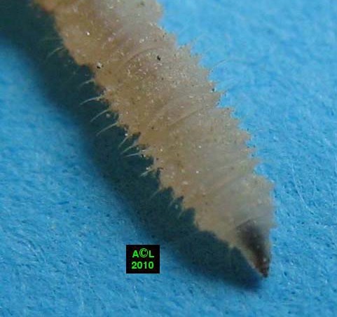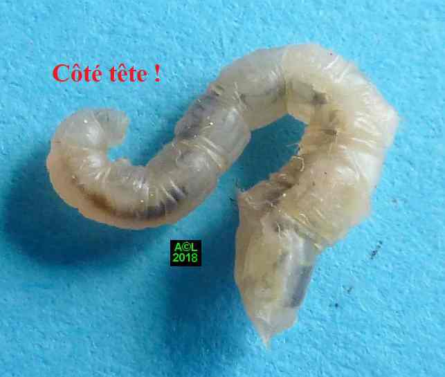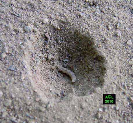 Sauf à tamiser le substrat, ou à bien connaître la bestiole, il n'est pas toujours aisé de trouver les larves. Outre leur relative petitesse (y compris à terme), elles sont en effet toujours enduites de particules sableuses ou poussiéreuses, et de surcroît elles ne bougent pas plus de la tête que du derrière. Cette immobilité, quasi cataleptique, est bien sûr une forme de défense ( savamment appelée "thanatose" ! ), car en temps normal, et donc au fin fond de son "antre", la bestiole est en fait extrêmement réactive.