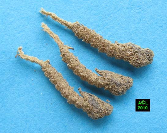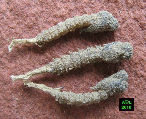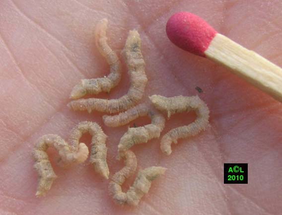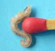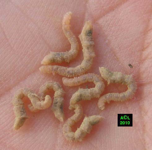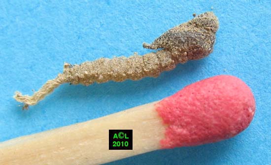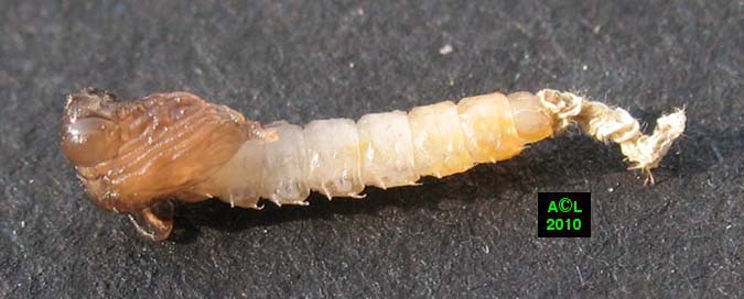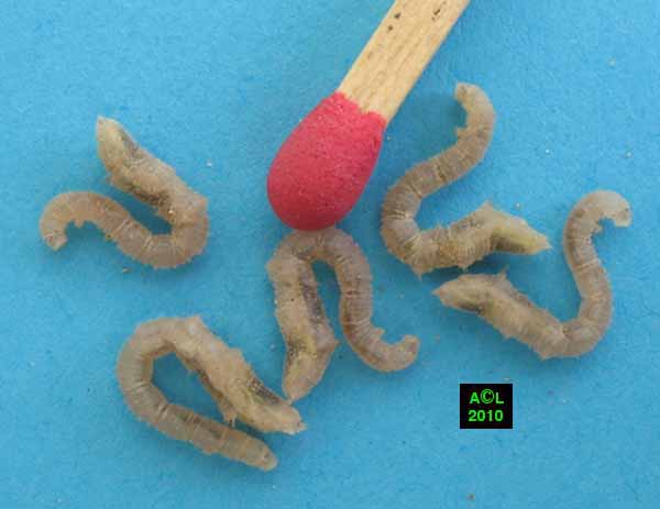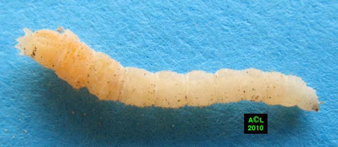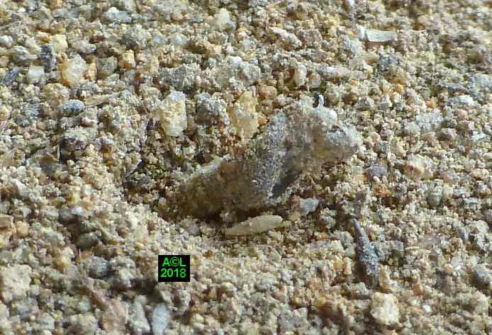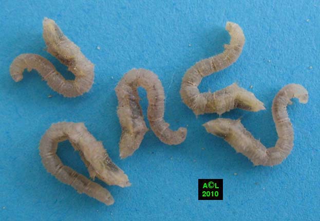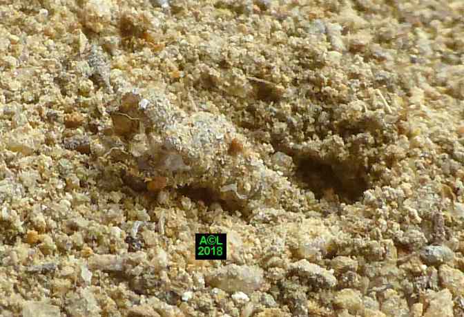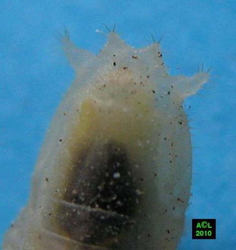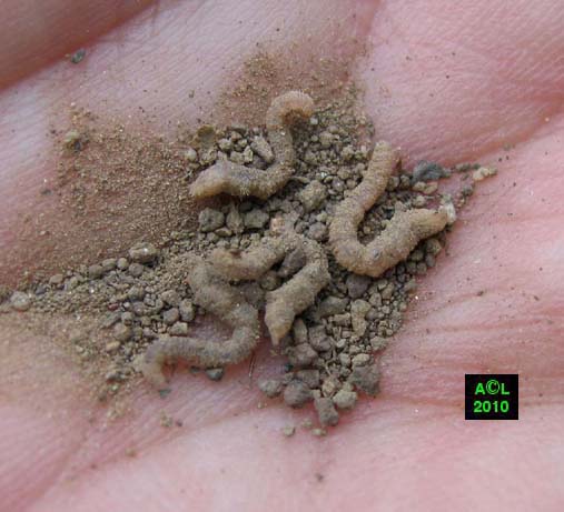Sauf à tamiser le substrat, ou à bien connaître la bestiole, il n'est pas toujours aisé de trouver les larves. Outre leur relative petitesse (y compris à terme), elles sont en effet toujours enduites de particules sableuses ou poussiéreuses, et de surcroît elles ne bougent pas plus de la tête que du derrière. Cette immobilité, quasi cataleptique, est bien sûr une forme de défense ( savamment appelée "thanatose" ! ), car en temps normal, et donc au fin fond de son "antre", la bestiole est en fait extrêmement réactive.