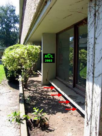Bordant le couloir des salles de Travaux Pratiques de la Fac, de grandes jardinières extérieures (ci-dessous à gauche) sont situées sous une avancée du bâtiment. Il s'ensuit, orientation aidant, qu'elles ne voient jamais une goutte d'eau, qu'elle soit de pluie ou d'arrosage, d'où un sol en grande partie dénudé, et réduit à l'état de poussière, du moins en surface.