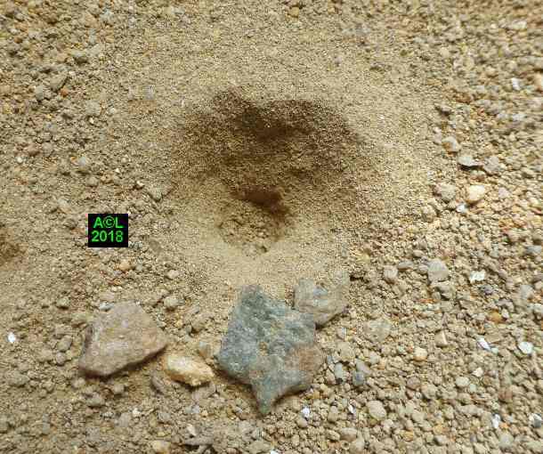 Au fil de de ces"pelletées" l'entonnoir se creuse, prend forme, et à terme la larve y aménage un espace plus ou moins plan en-dessous duquel elle se positionne en embuscade. De nuit la partie antérieure est souvent apparente, et de jour elle est au contraire dissimulée sous une fine pellicule du substrat