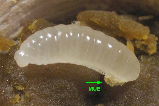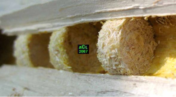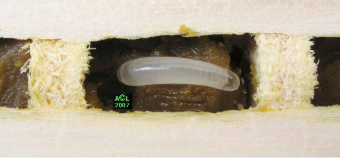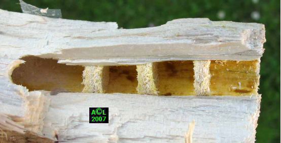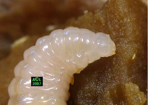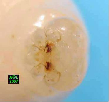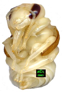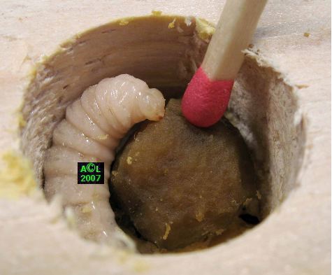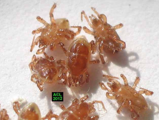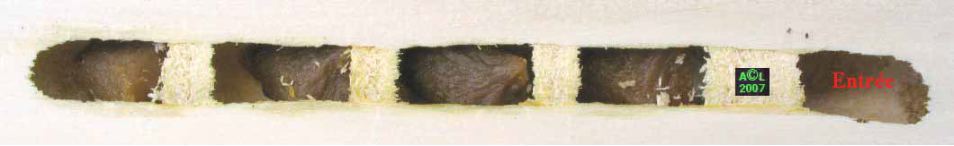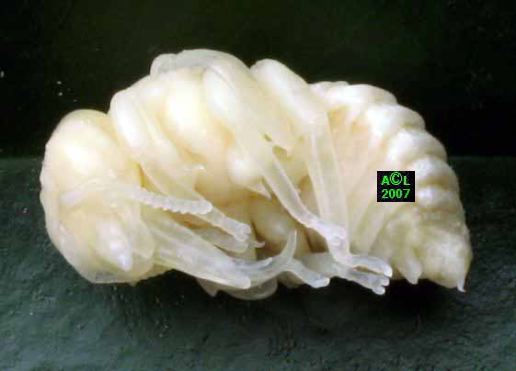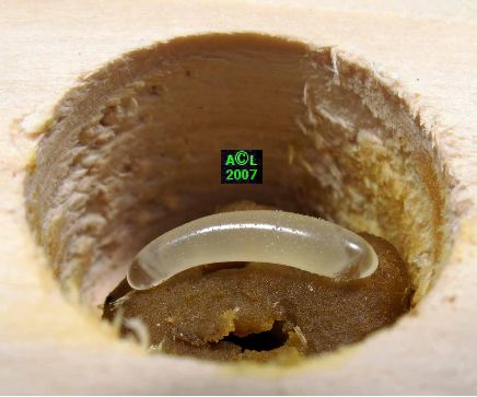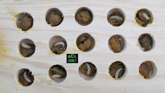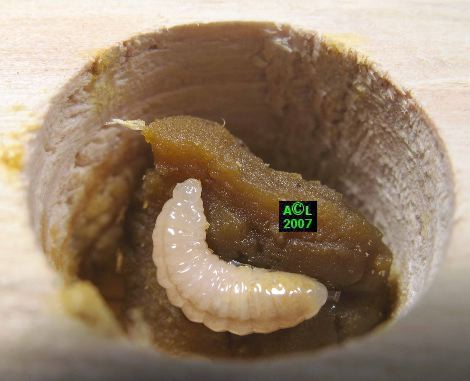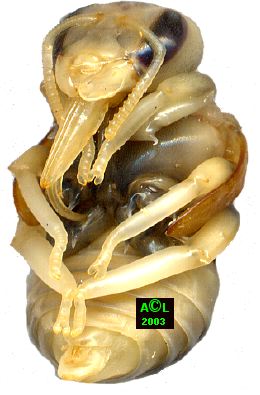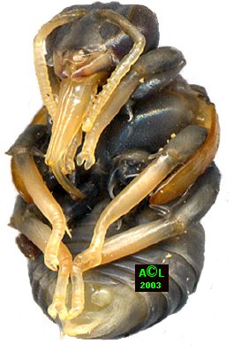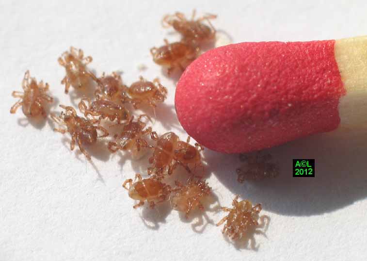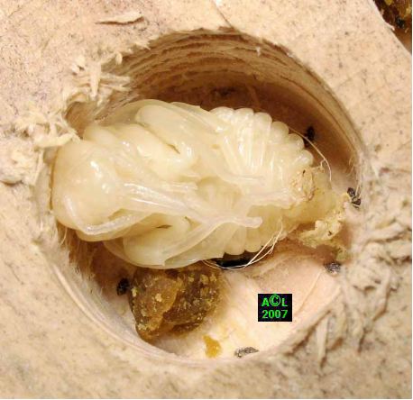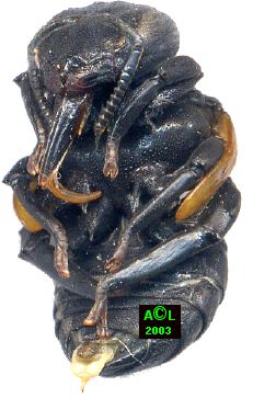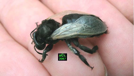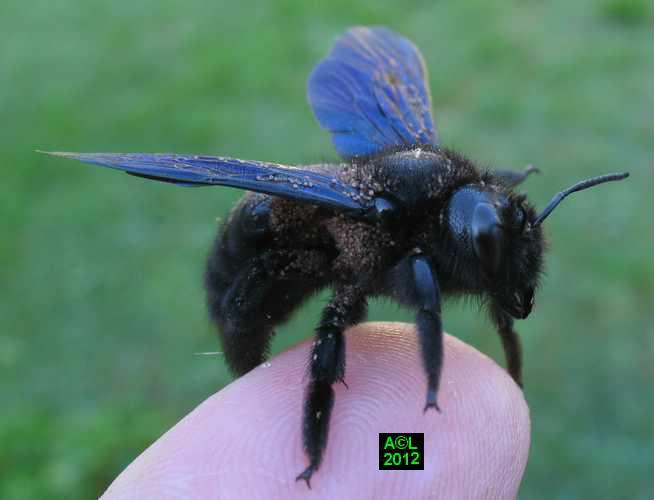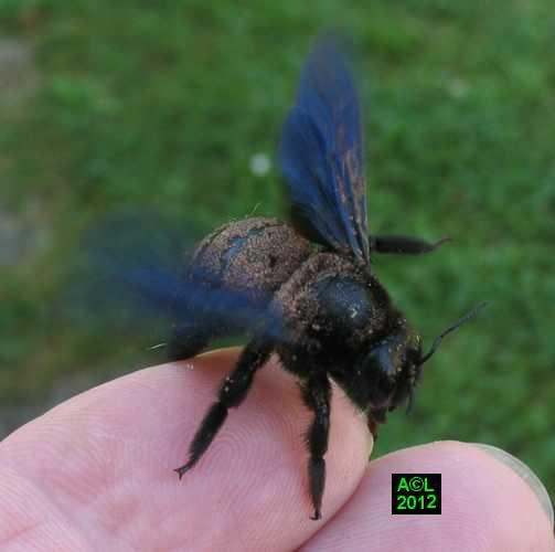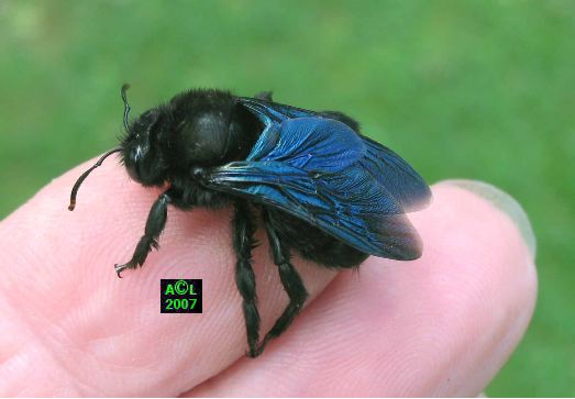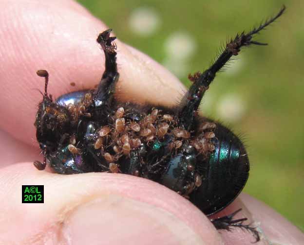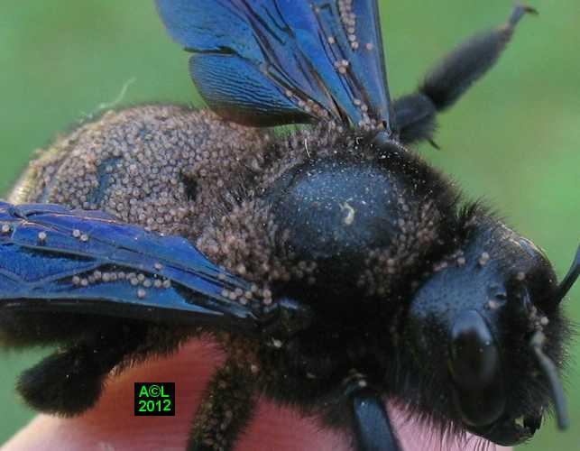Xylocopa violaceaLes acariens nous posent parfois problèmes, mais ils en posent pareillement aux insectes, et ce n'est pas le malheureux xylocope ci-dessous, qui dira le contraire ! Présentement il s'agit en effet d'acariens parasites du type "encroûtant", lesquels vivent aux dépens de l'hôte et finissent par littéralement l'épuiser. Les acariens dits "phorétiques" (ci-dessous également) font seulement du "stop", et si leur nombre peu constituer une véritable gène, c'est toujours momentané.